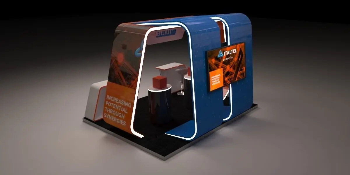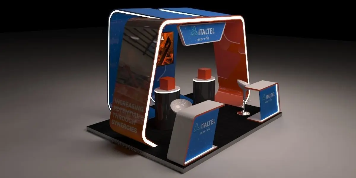 Modern Stand, for communications company, designed in mdf, with led screens, led lights, 3x3m area