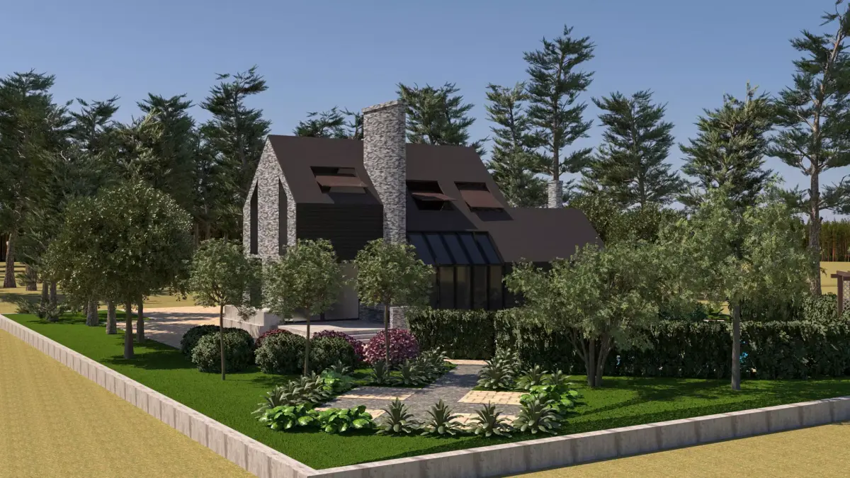 Landscaping & Environment: The model is set on a lush property bordered by a simple retaining wall. It includes diverse, realistic vegetation: mature pine trees and deciduous trees line the perimeter, while the immediate yard features well-maintained green lawns, various shrubs.