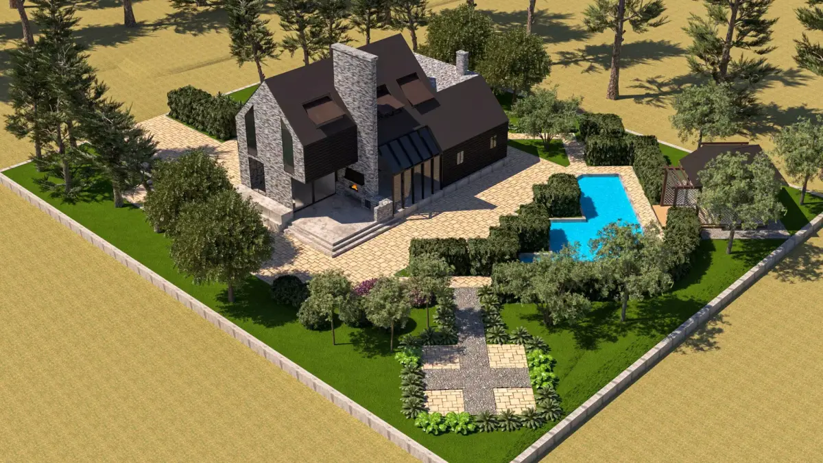 This model captures a sophisticated blend of modern design elements and rustic natural surroundings, offering a truly aspirational lifestyle.This complete scene is ready to drop into your project, offering a compelling and high-value asset for buyers looking for a premium residential model.Key Features of the Model:Architectural Detail: The two-story house features a striking façade combining dark, sleek wood paneling with a prominent stone chimney and accent walls. The design includes large windows, a central glass conservatory/atrium, and a covered outdoor patio with a fireplace, blending indoor and outdoor living seamlessly.