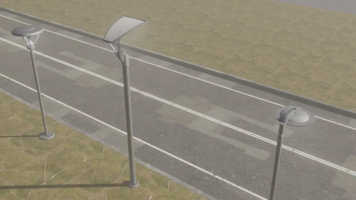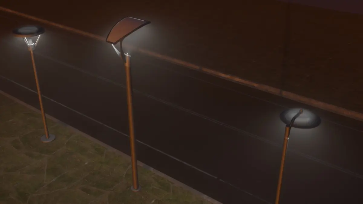 These street lamps are set for HD rendering in any engine, realtime to raytrace. Using Face Weighted Normals and tiling textures you get crisp reflections, highlihgts and details at game ready poly counts.