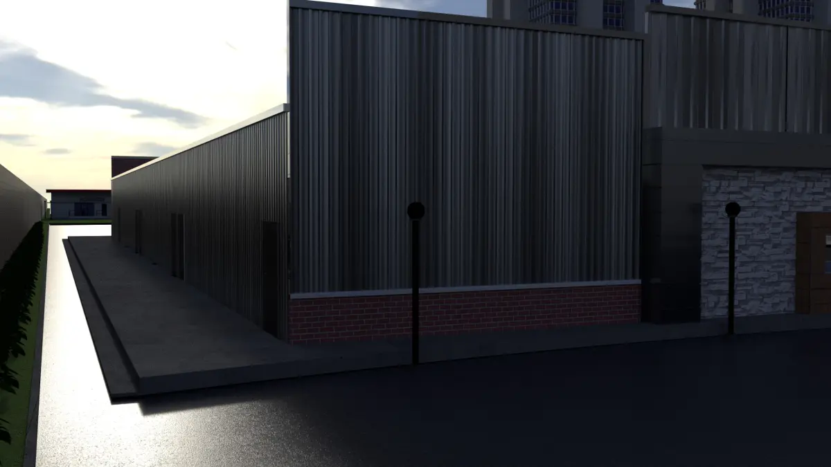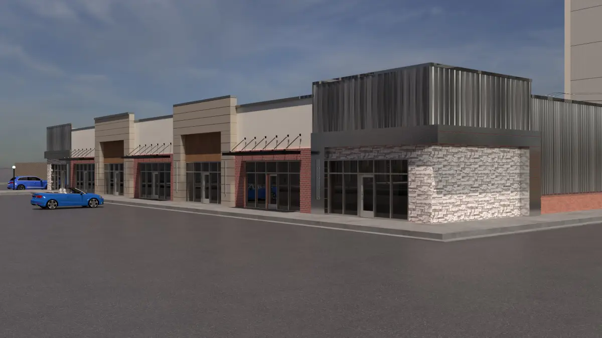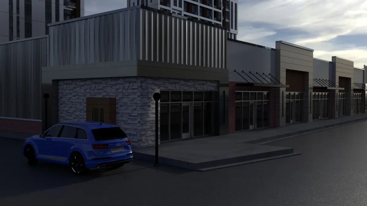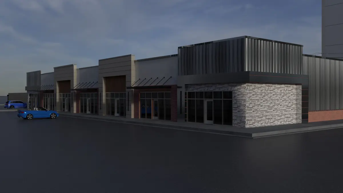 This 3D model showcases a modern strip mall with retail storefronts, featuring a simple exterior layout with metal cladding, brick, and stone finishes. The scene includes parked cars and realistic proportions, making it ideal for use as a background or concept scene in architectural visualization or urban environments.Note: This model is intended for conceptual or background use only. It does not include interior detailing.