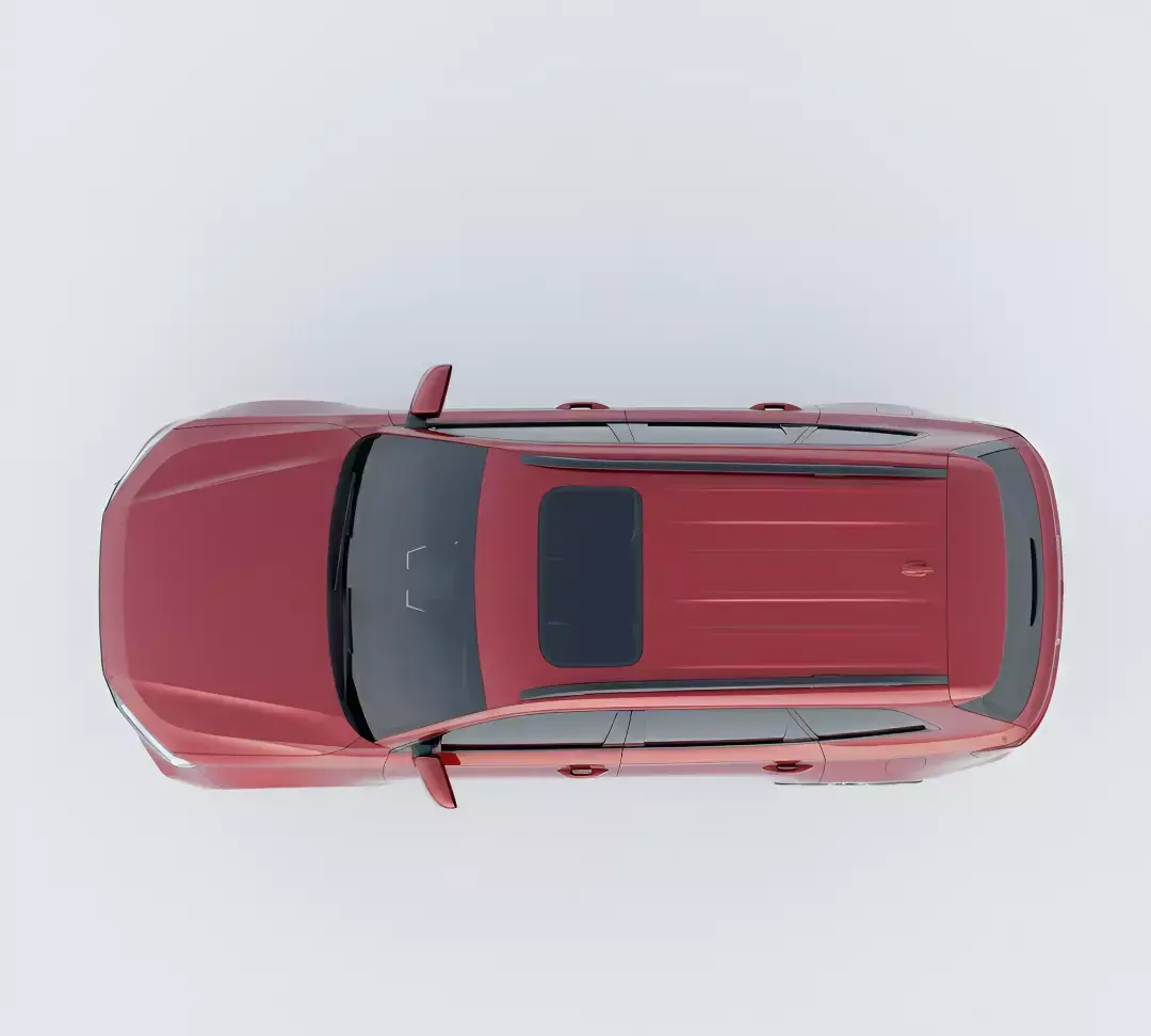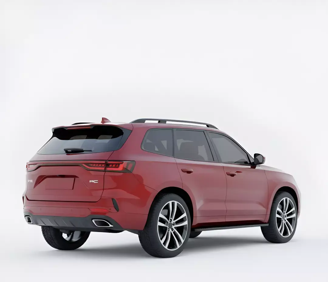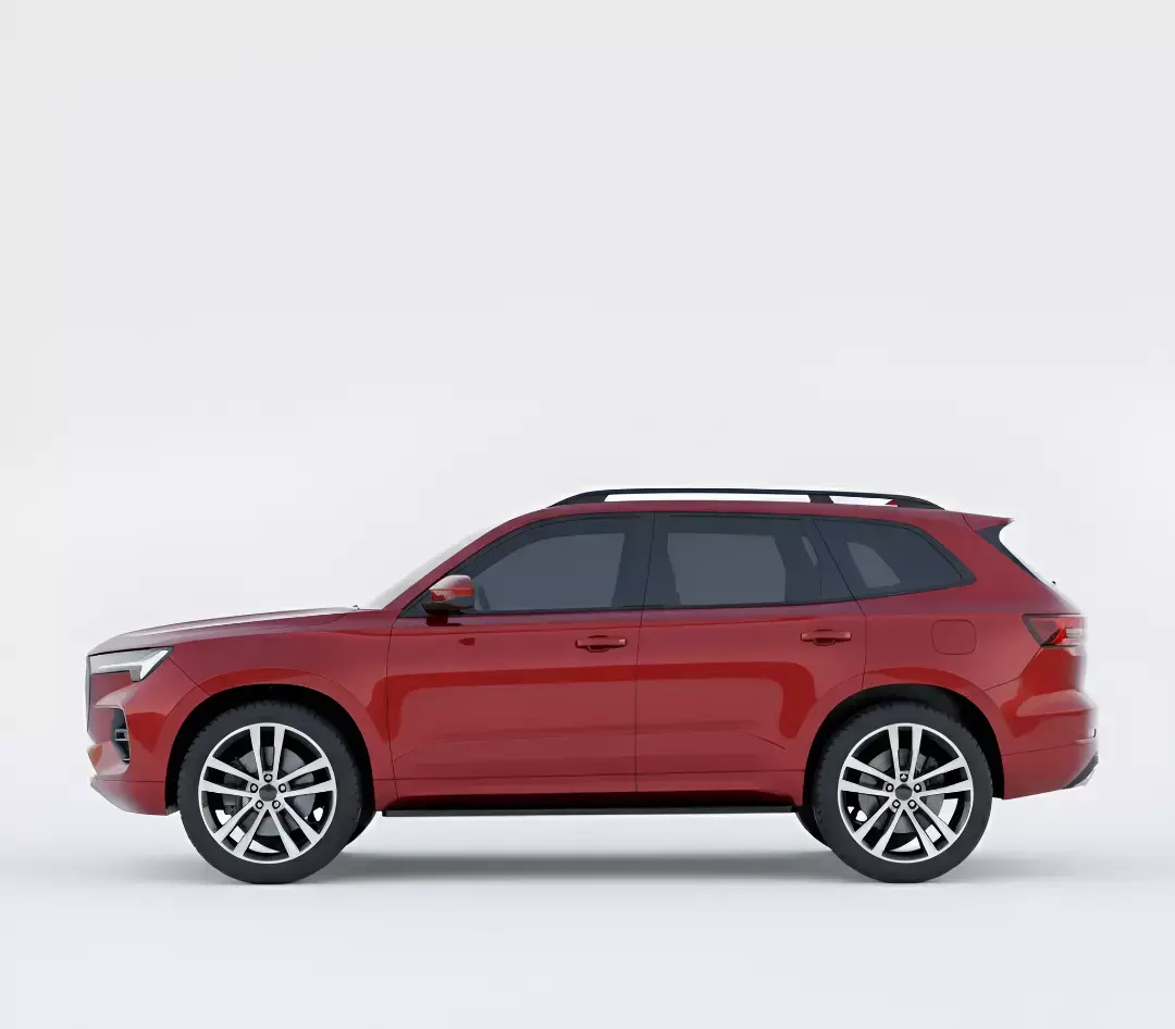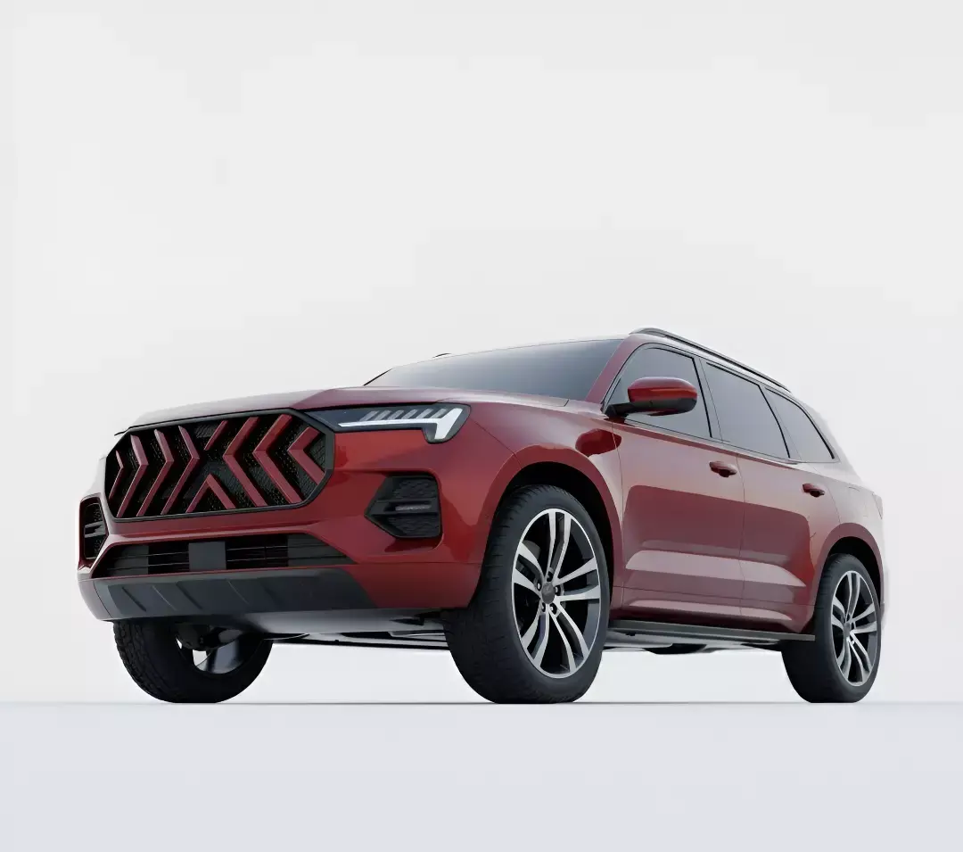 A high-quality 3D model of a modern SUV rendered in a rich burgundy finish. This vehicle features a striking, aggressive front grille with a unique 'X' pattern and sharp, angular LED headlights, giving it a futuristic and distinctive look. The model includes detailed elements such as roof rails, textured tires, and multi-spoke alloy wheels. Set against a clean, white studio background, this asset is ideal for product showcases, automotive advertising, and architectural visualizations. It can be used for close-up renders or integrated into a larger scene to add a touch of modern sophistication.