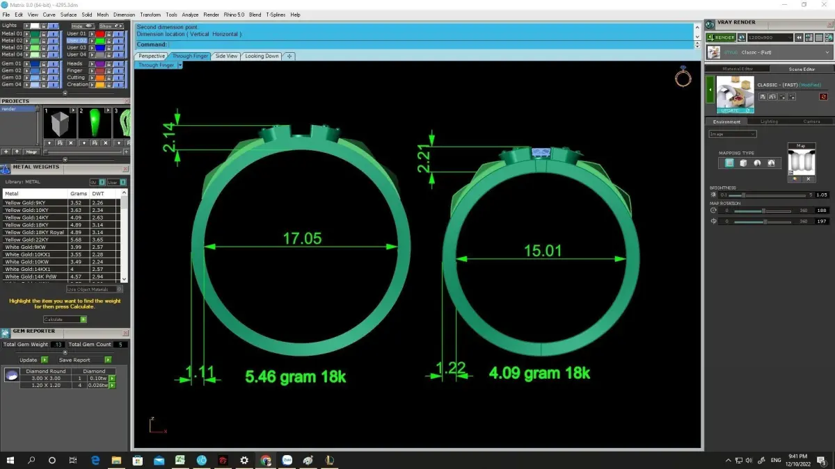 All preview images display full dimensions, gemstone sizes, stone count, and metal weight information. The model is fully prepared for lost-wax casting and professional jewelry manufacturing.