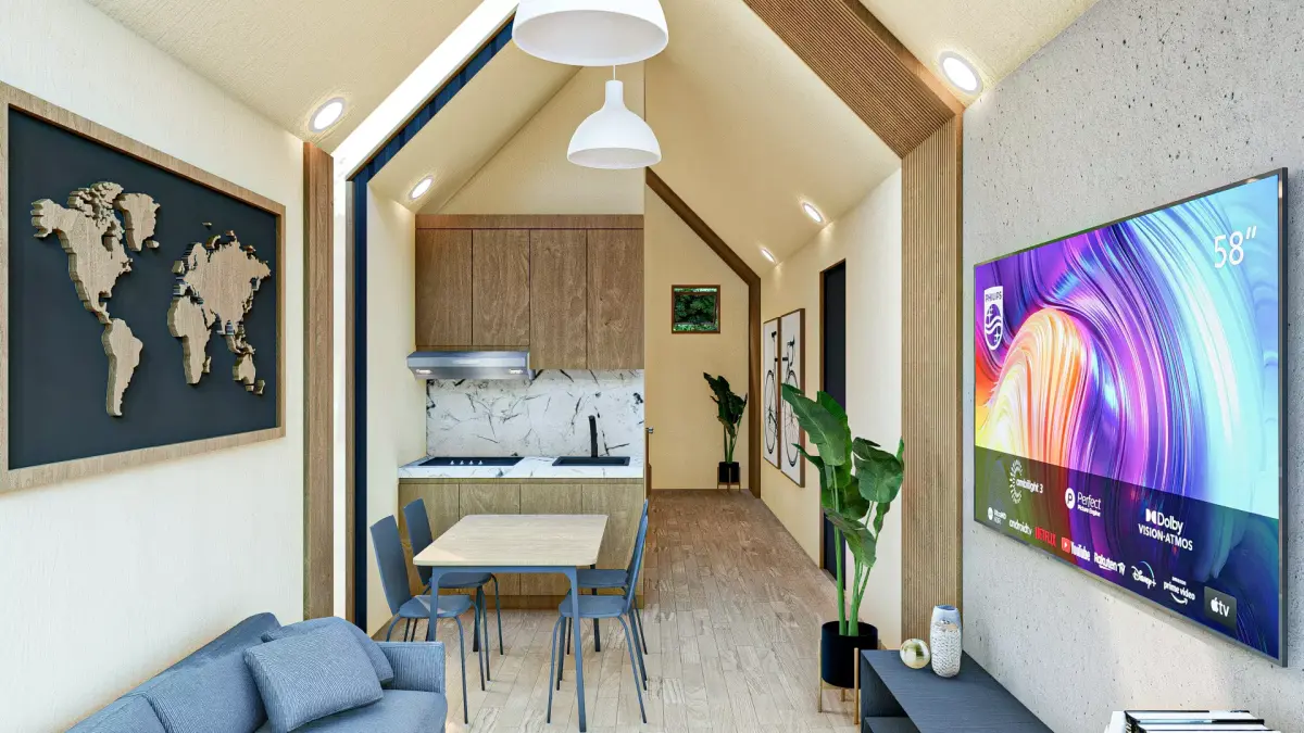 This modern A-Frame inspired tiny house features clean lines, a minimalist form, and functional compact living. Designed with an elevated foundation and extended deck, the house blends indoor comfort with outdoor living space—perfect for residential cabins, eco-lodges, or small housing projects.