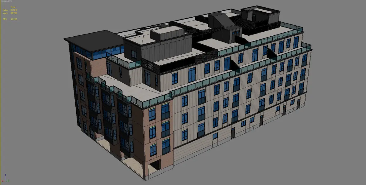 GEOMETRY AND OBJECTS INFORMATION:-Realistic 3D model of a Modern Townhouse Building 2.Real-world scale in feet/inch.Same layer objects attached for easy selection and objects are logically named.All objects in one group.No detail interior wall only basic out wall.