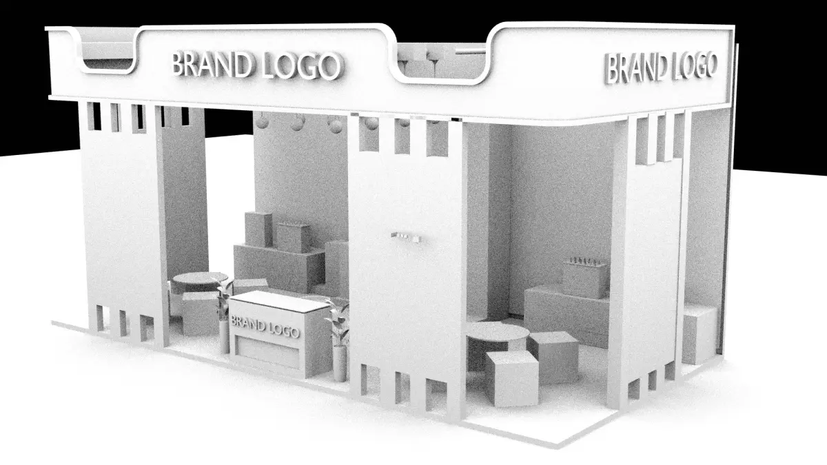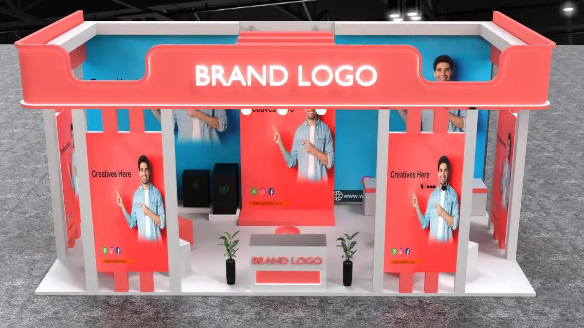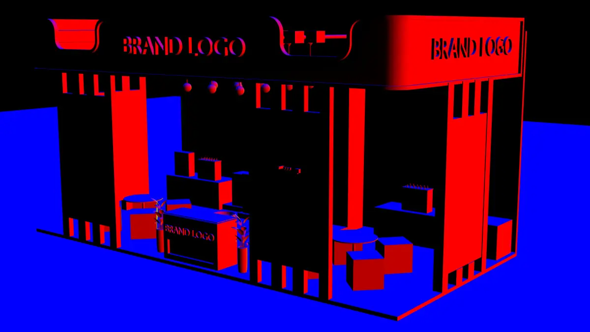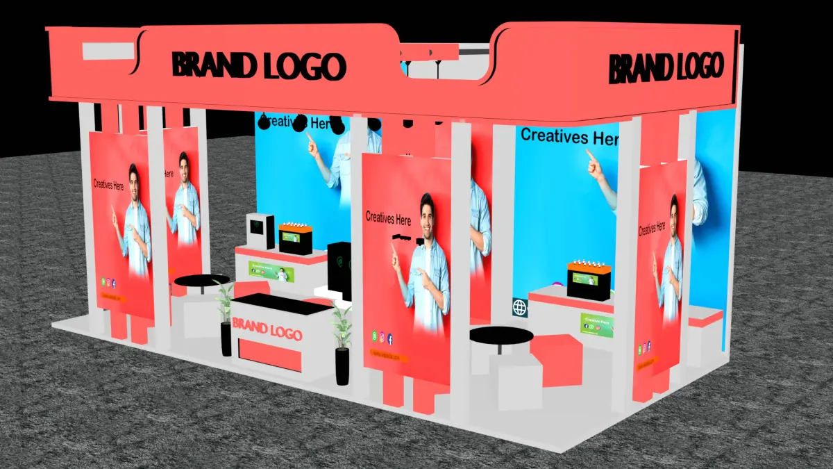 Description: This exhibition booth is designed with an eye-catching red and white theme, featuring large backlit graphics, illuminated brand signage, and modular furniture. Designed to attract footfall in trade shows and expos, the booth offers vibrant visuals and a modern layout with real-world scale accuracy.Key Features:Striking red overhead structure with integrated LED brand lightingLarge vertical banners with image textures and promotional creativesModular counters and stools for interaction and product placementUse of potted plants and ambient lighting for added realismDesigned in Blender using real-life dimensionsTechnical Details:Modeled and rendered in BlenderImage textures used for banners and product brandingBloom effect enabled for lighting enhancementRendered in real-world scale, no layout dimensions disclosedMaterial shading optimized for product realismRender Passes: