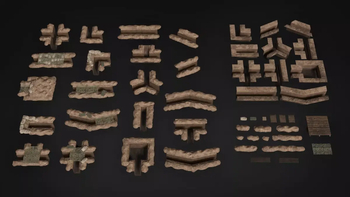 This pack includes 51 realistic modular trench assets designed for modern, military, or post-apocalyptic environments.You’ll find ready-made trench sections, wooden wall panels, sandbags, and modular ground parts that can be freely combined to build detailed battlefield fortifications.