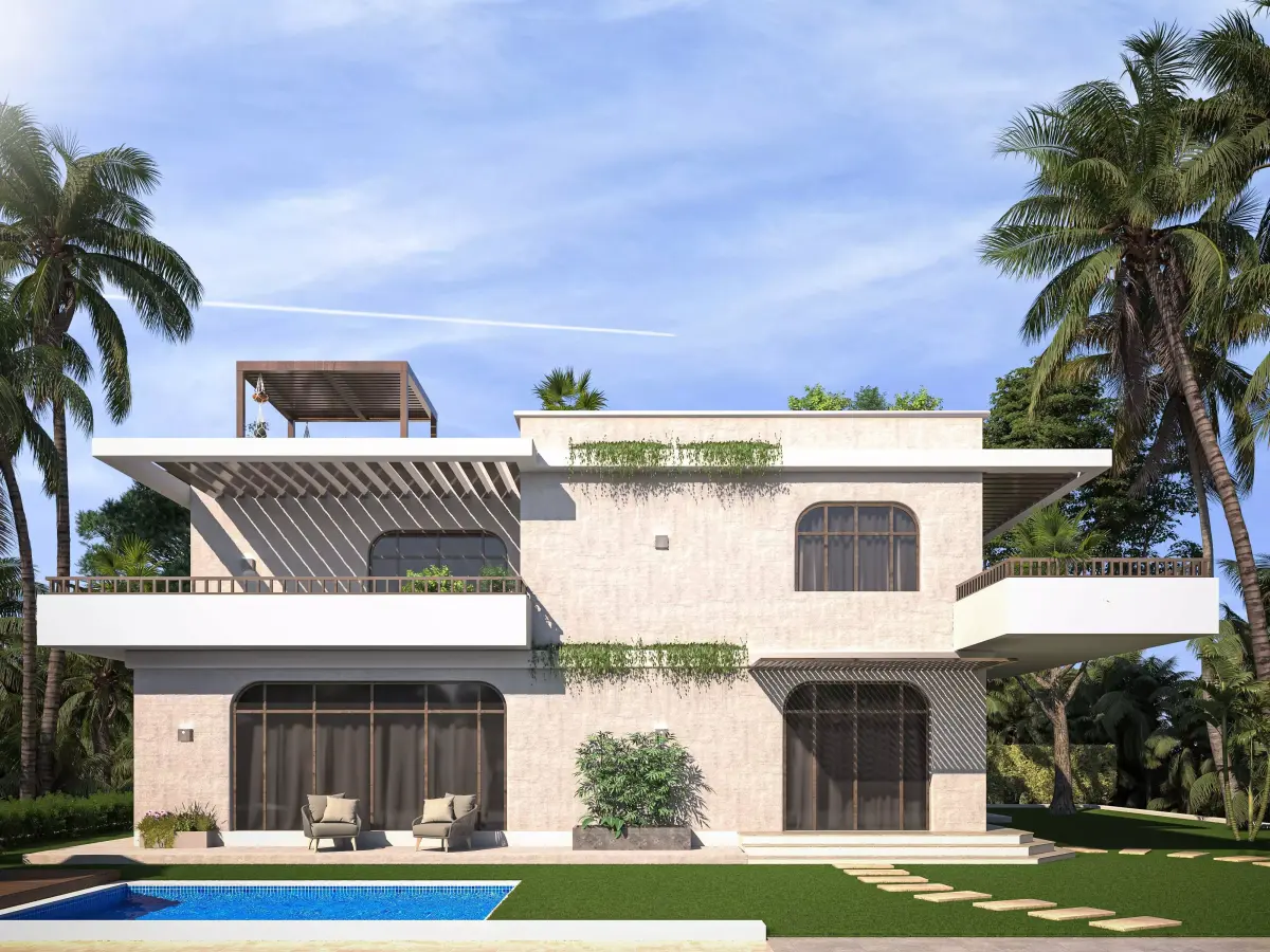 Scene Type: Exterior architectural visualization with tropical landscaping.