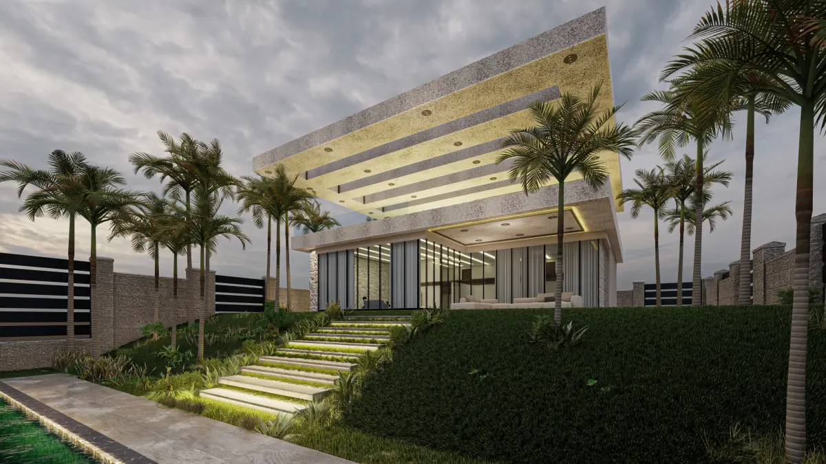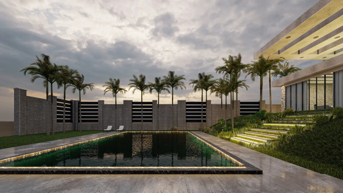 Luxurious villa exteriorSwimming poolTropical landscaping with palm trees and greeneryModern pergola and outdoor lounge areaAtmospheric evening lightingImportant Notes: