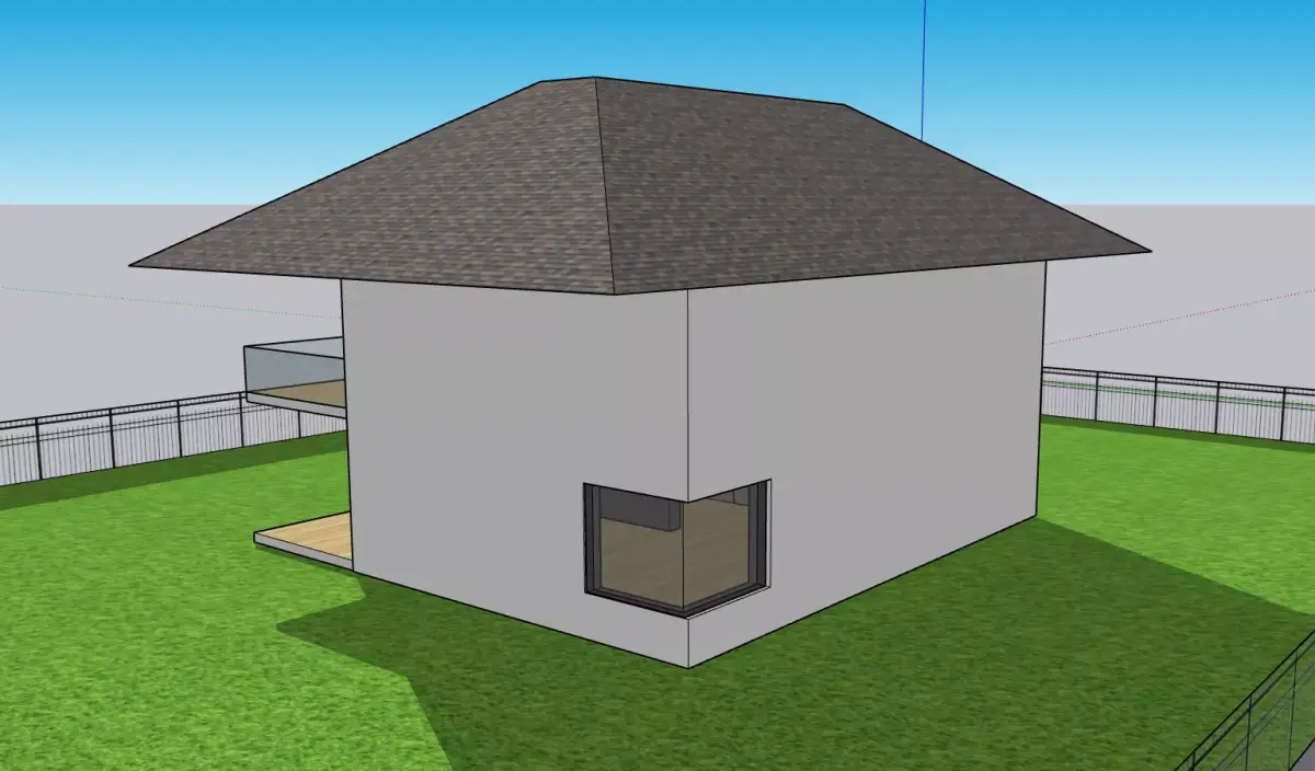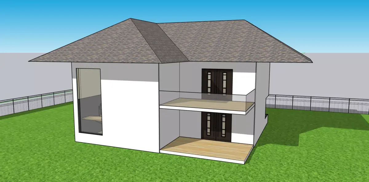 A 3D-rendered modern two-storey residential house featuring a hip roof design, clean minimalist exterior, and elevated balcony spaces. The structure includes large glass windows for natural lighting, wooden deck finishes on the balcony and ground-level terrace, and a spacious green lawn area surrounding the property. The design emphasizes simplicity, functionality, and contemporary architectural style, ideal for modern residential living.