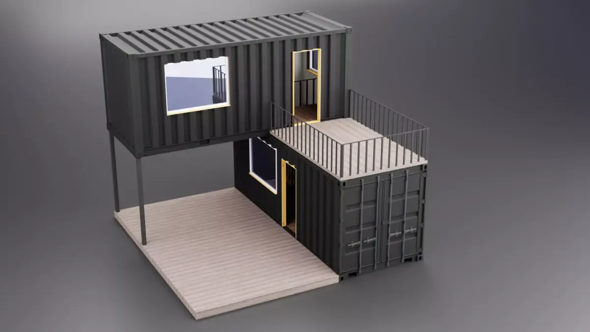 Second floor: bedroom with balcony access, terrace above the lower container.
