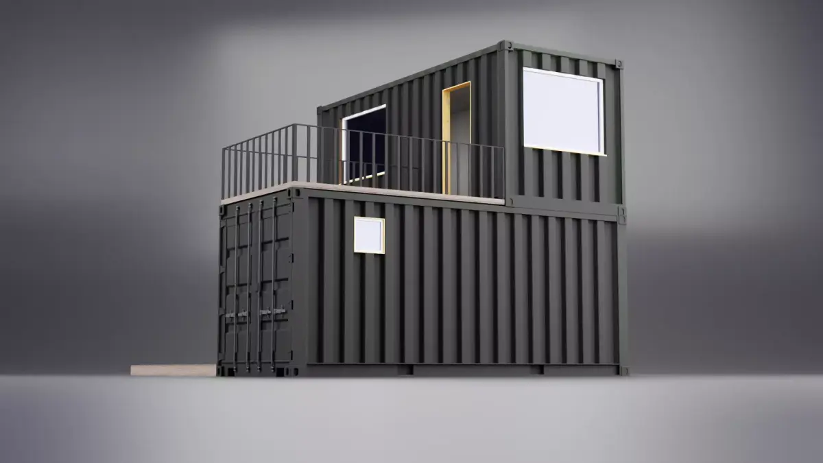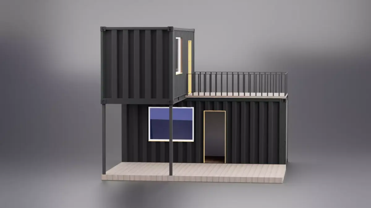 This is a high-quality 3D model of a modern two-story container house, created in Blender at real-world scale (1:1). The model features clean topology, full UV mapping, seamless PBR textures, and normal maps. All glass materials are set with realistic transparency.