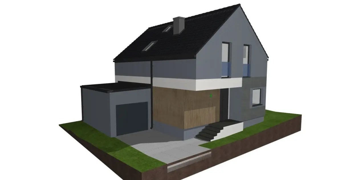 A model of a modern single-family, one-story house made as an external body. The model has a full body visible on the visualization as well as car lights, driveway and fence. The model does not include the environment such as grass, trees, vehicles or people.