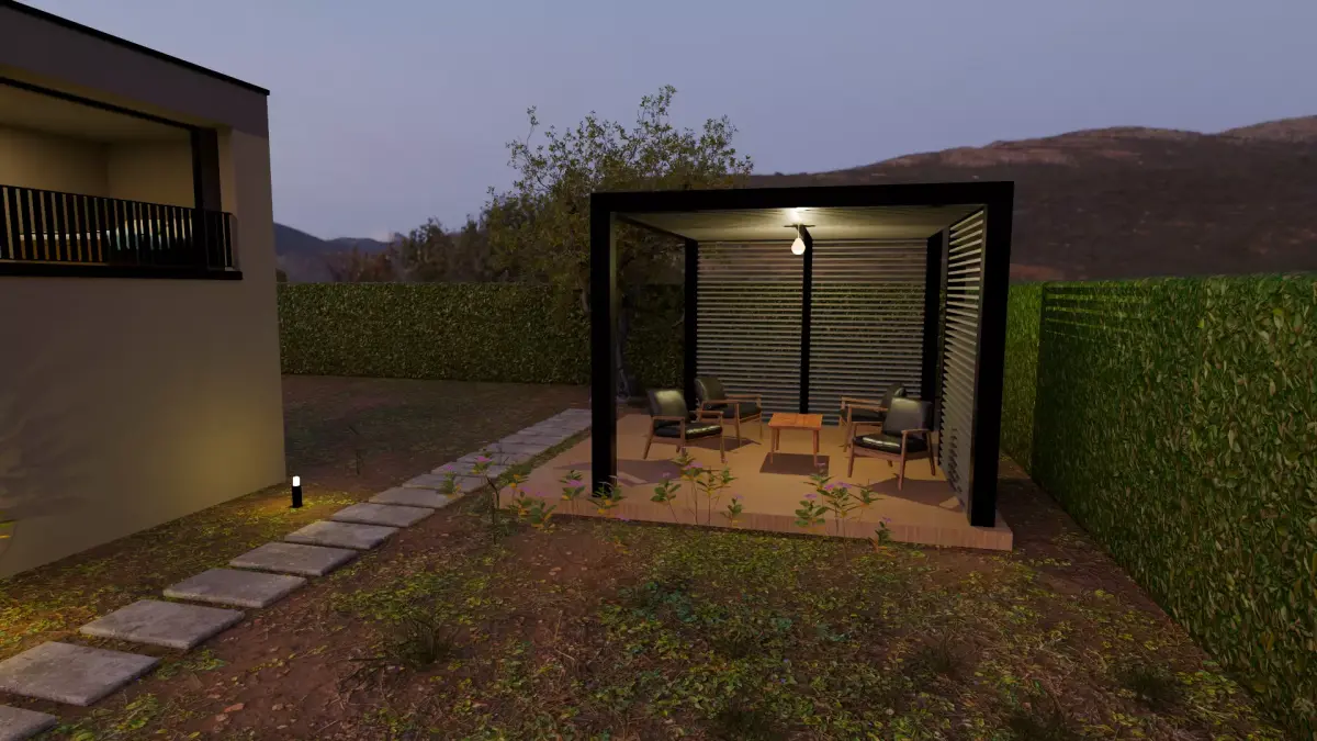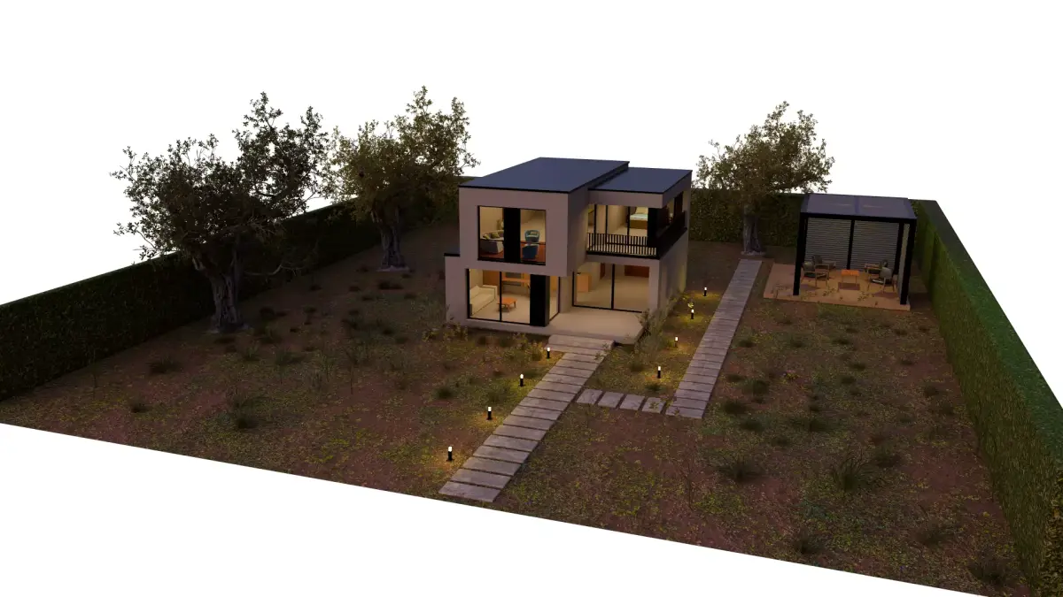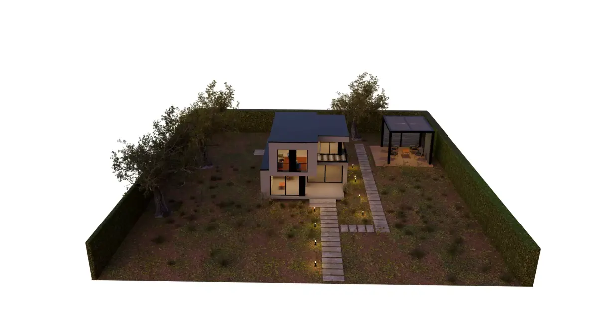 This is a high-quality 3D model of a modern two-story house designed with minimalist architecture and clean lines. The scene includes a landscaped yard, stone pathway with ground lights, and a stylish pergola-covered outdoor seating area. Ideal for architectural visualization, real estate presentations, or use in games and VR environments.