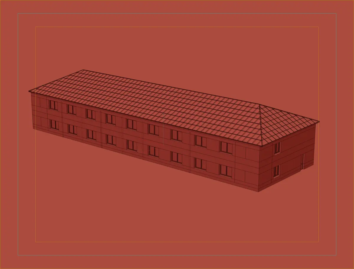 A compact two-story residential building featuring a tiled facade and dark pitched roof, ideal for suburban environments.