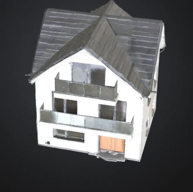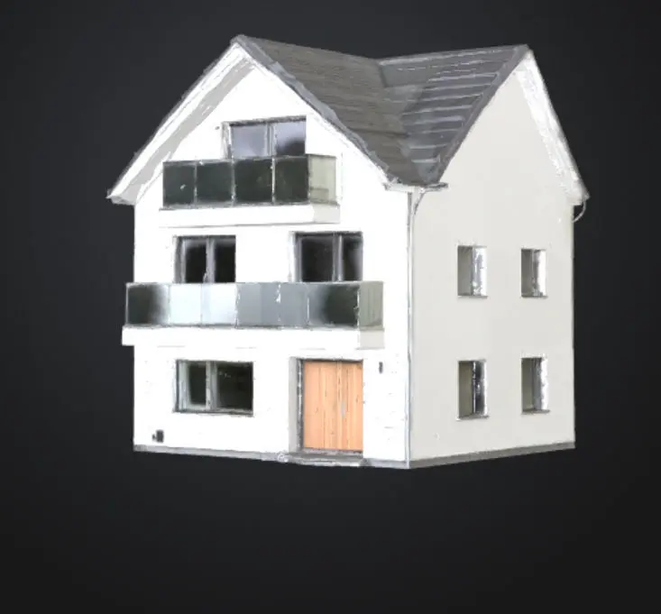 A stunning AI-generated image of a two-story modern luxury villa featuring a sloped roof, dark reflective granite exterior walls, and decorative balcony glass. The house is surrounded by lush green plants and showcases a minimalist, high-end architectural style. this image is ideal for real estate marketing, or architectural presentations