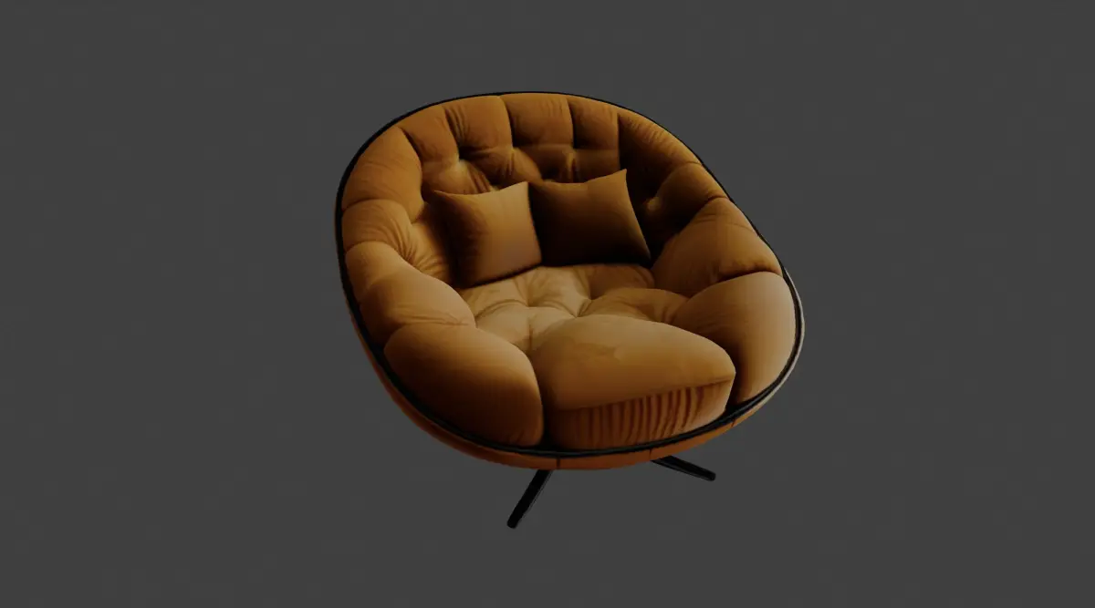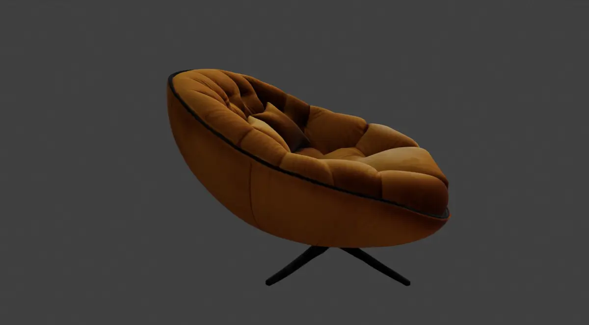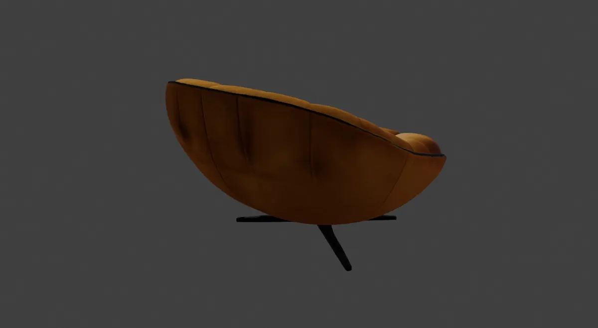 This stunning 3D model features a luxurious, modern lounge armchair, designed with exquisite attention to detail and contemporary style. The armchair showcases a round, enveloping frame upholstered in a plush velvet material with a rich, golden-orange hue, adding both comfort and sophistication to any space. Its tufted texture, complete with subtle stitching and soft, cushioned detailing, ensures an inviting appearance and a realistic aesthetic.The chair's design incorporates a sleek black metal swivel base, providing stability and functionality while enhancing its modern appeal. Its ergonomic form is complemented by additional cushions for extra comfort, making it perfect for use in living rooms, reading nooks, or stylish office spaces. The detailed texture mapping ensures a highly realistic representation of velvet, capturing subtle reflections and depth in the fabric.This 3D model is available for download in gmb format with all textures included, ensuring an easy and seamless workflow for designers. It is also provided in fbx format, making it compatible with most 3D software platforms. Whether you’re working on an interior design visualization, an architectural project, or a creative animation, this versatile armchair model will enhance your scene with elegance and realism.The model has been meticulously optimized for both high-quality rendering and efficient performance, making it ideal for a variety of applications. Add a touch of luxury and comfort to your projects with this beautifully crafted armchair, designed to fit seamlessly into contemporary settings.