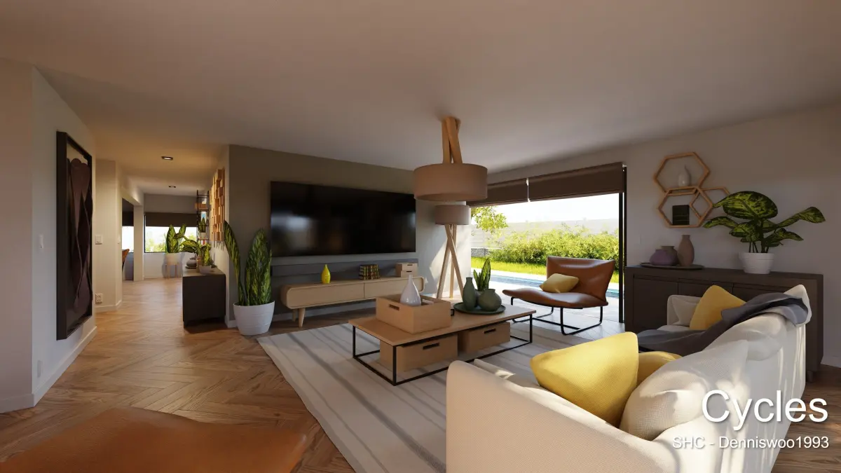 All cycles settings are already setup (samples, bounces, denoiser) the only thing manually adjusted is the different camera exposure for every roomWhen rendering with Cycles, Try to only turn on the lights of the spaces that are actually visible on the renders. Especially the sunlight’s quality will be much more noisy when many lights are turned on.