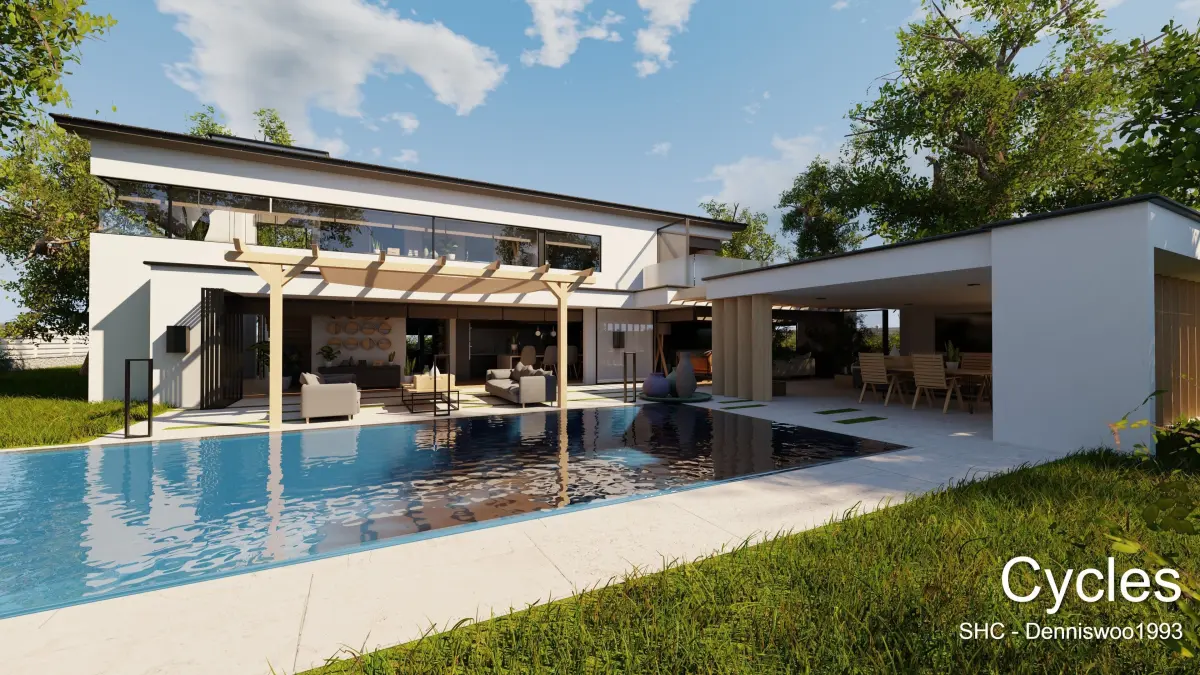 There are 2 blend files available with both a fully baked day and night version of this villa, Both versions can be set to cycles