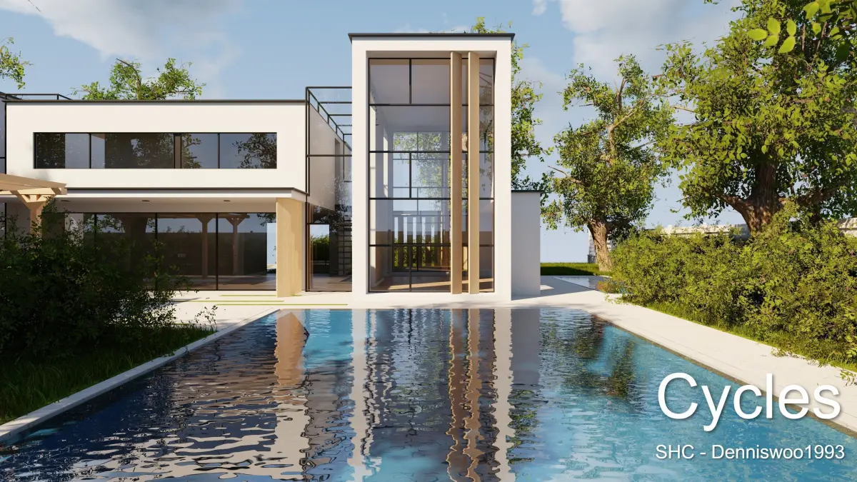 There are 2 blend files available with both a fully baked day and night version of this villa, Both versions can be set to cycles