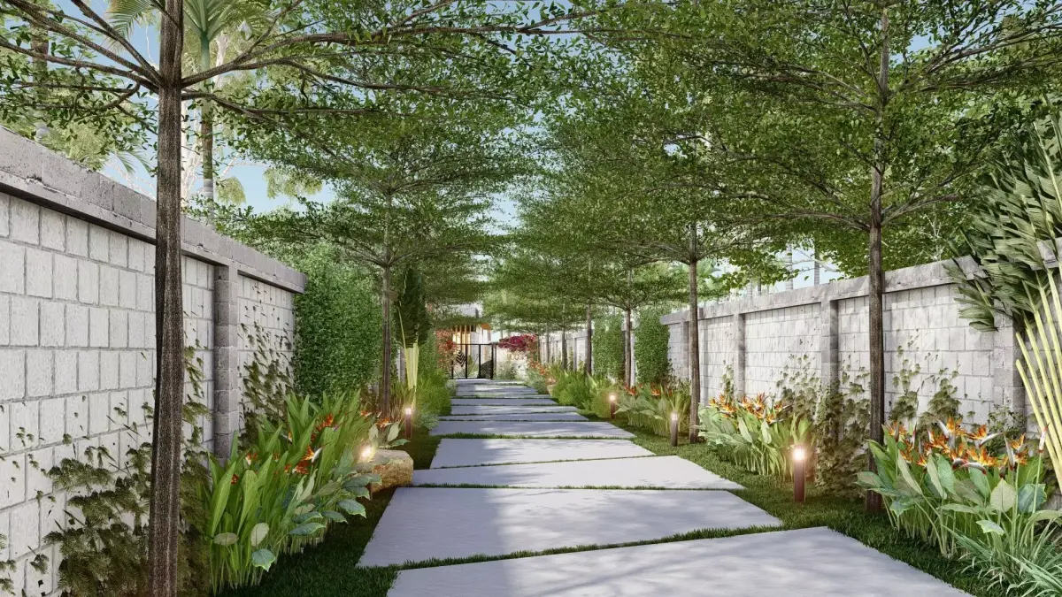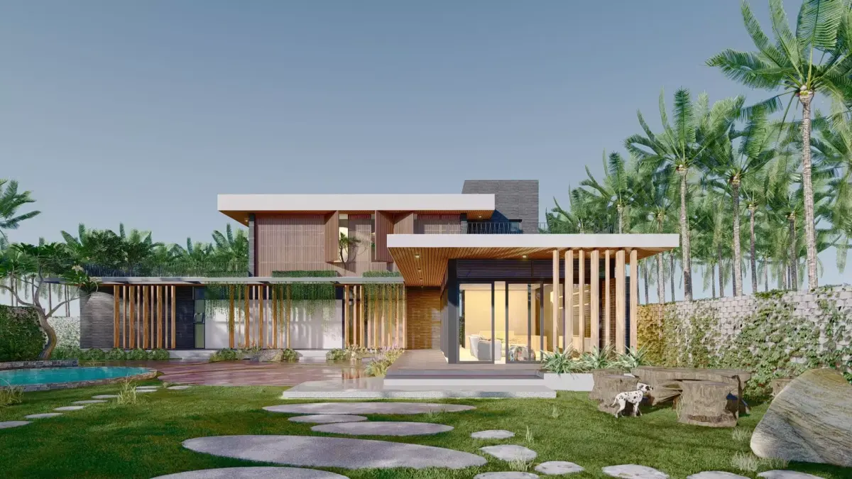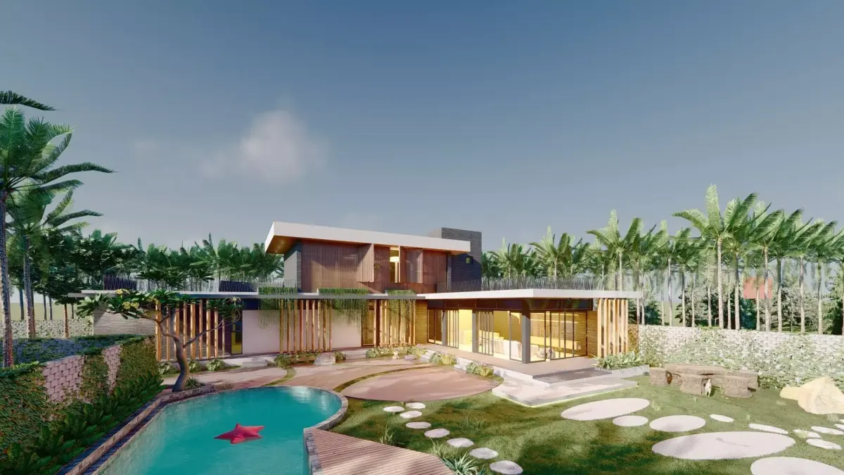 This is my project in my country. The modern villa in tropical garden with simple material, glass door, simple funiture and large front yard for children have fun. The garage can accommodate many cars. The outdoor swimming pool. Behind the villa is the farm with more vegetable