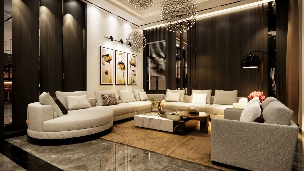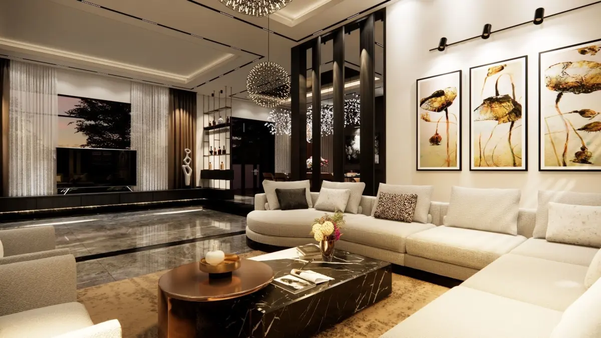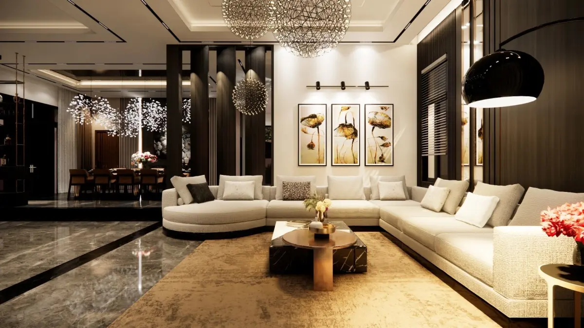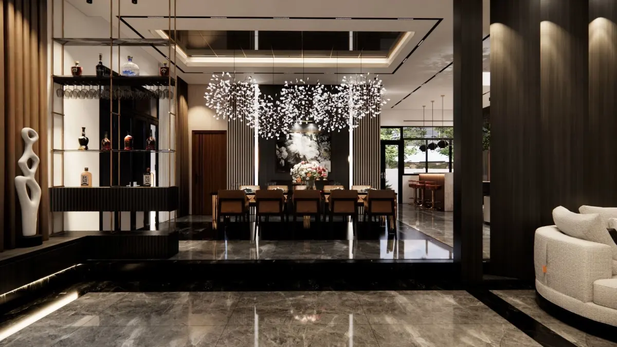 this is the 1st floor of a modern villa, including living room, dinning room and kitchen