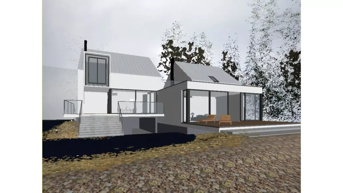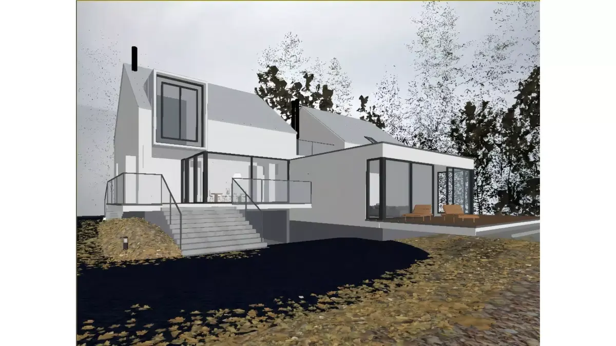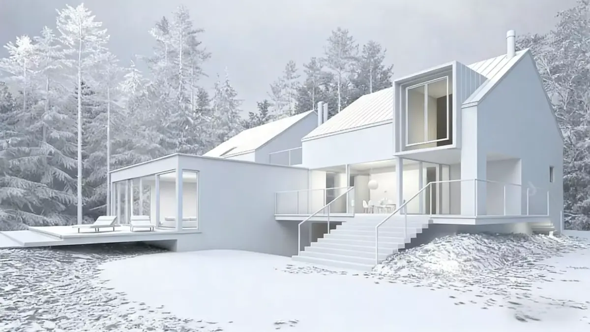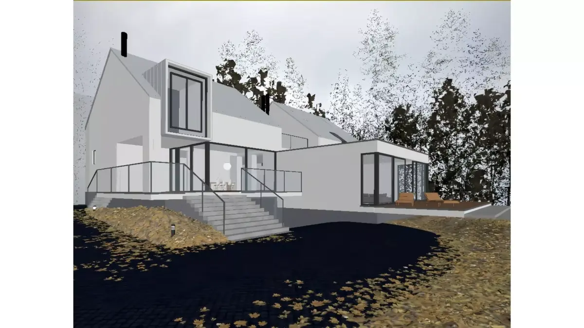 This is a 3D architectural model of a single-family villa in a modern minimalist style. Dominated by a white color scheme, it is paired with large-scale glass curtain walls and a metal-textured roof, boasting a concise and transparent appearance.Nestled in a forested setting, the villa features a courtyard paved with dark stone bricks. Scattered yellow leaves evoke an autumnal ambiance. Overall, it presents a livable texture that blends nature with modern design, making it a forest residence that combines aesthetic appeal with practical functionality.