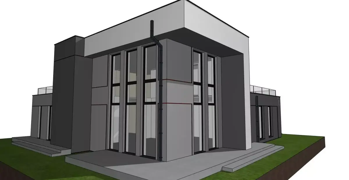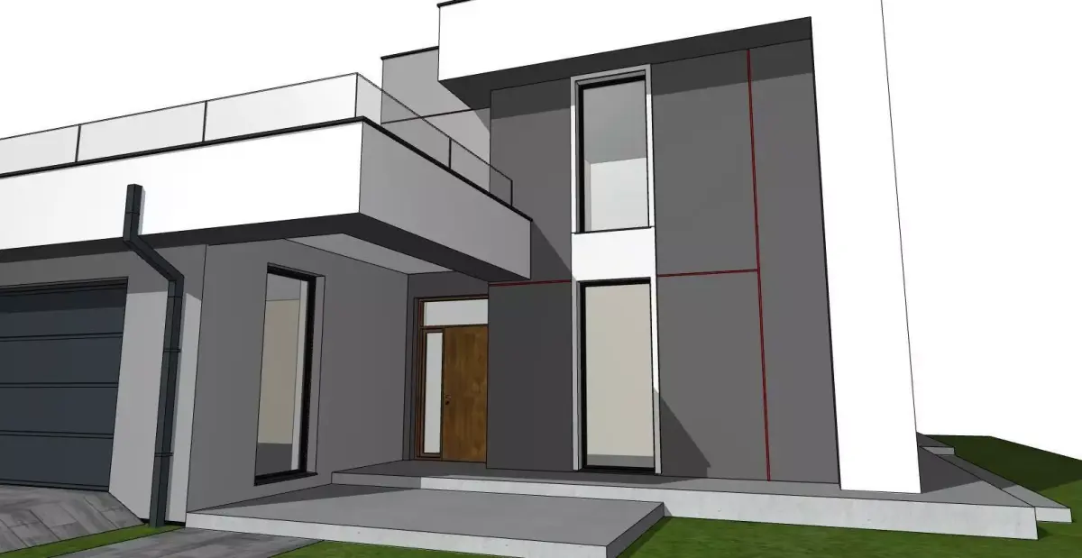 A highly detailed 3D model of a modern two-story villa designed in a minimalistic and geometric style.The architecture features strong horizontal and vertical lines, extensive glazing, and contrasting façade panels in dark and light tones — ideal for realistic visualization or conceptual presentations.