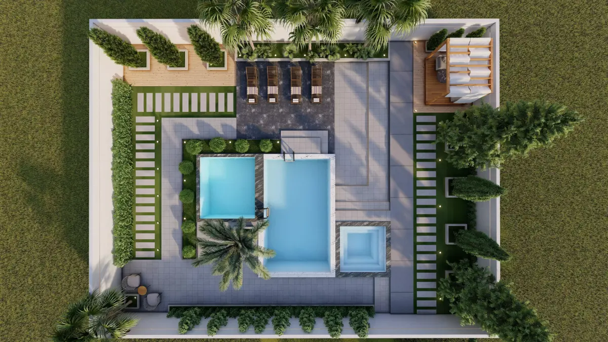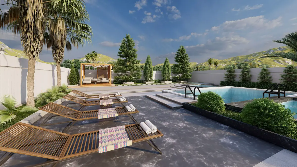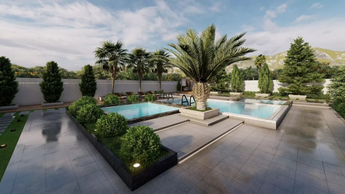 Included in this model:– Large modern villa courtyard / yard design– Two swimming pools with different levels– Jacuzzi area– Outdoor seating zones– Pergola structure– Hardscape elements and modern paving