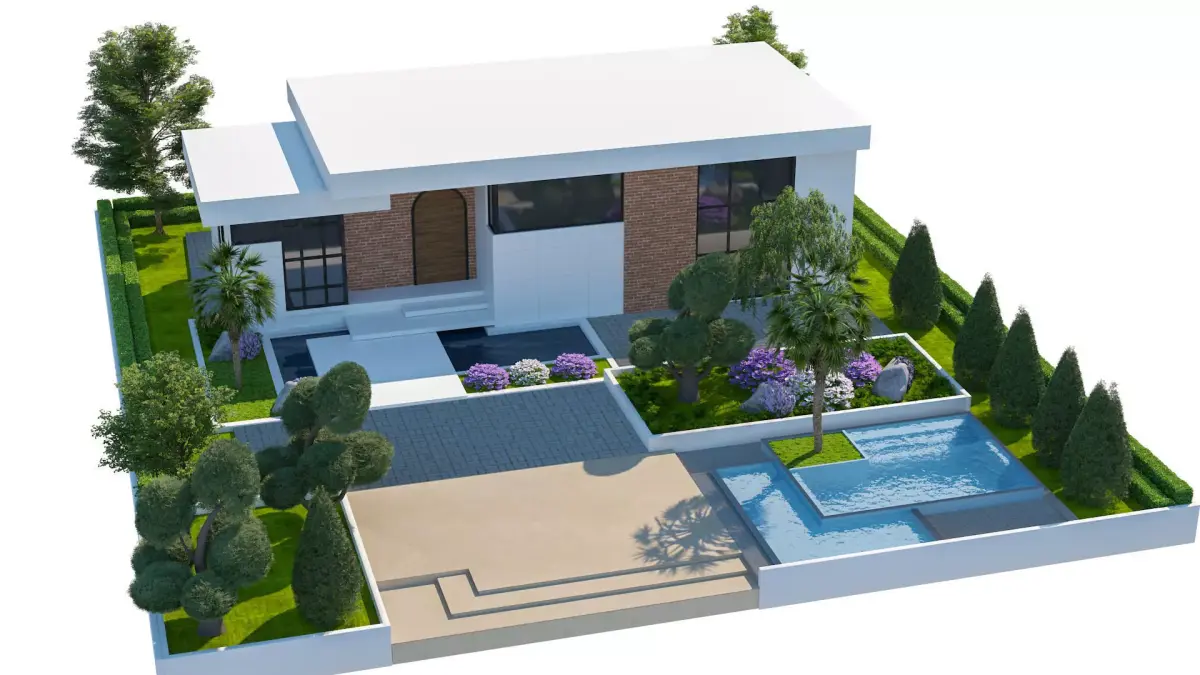 A high-quality, game-ready 3D model of a Contemporary Single-Story Villa featuring modern architectural design and lush, detailed landscaping. This asset is perfect for architectural visualization, open-world environments, real-time engines (like Unity, Unreal Engine), and high-end rendering projects. The design combines clean, white facades with warm brick accents, large glass windows, and striking outdoor amenities.