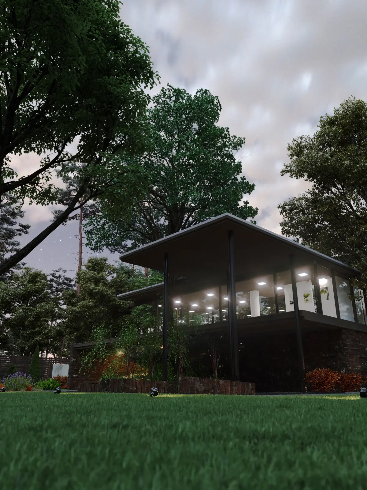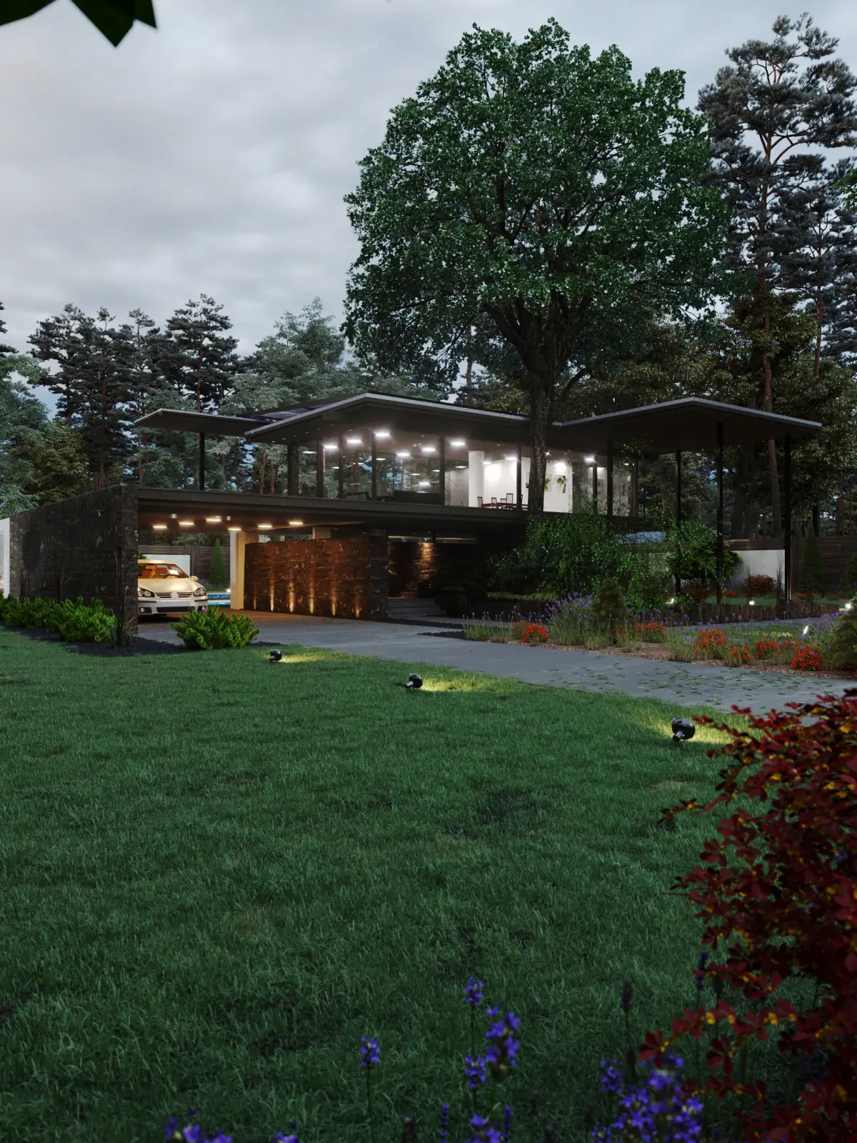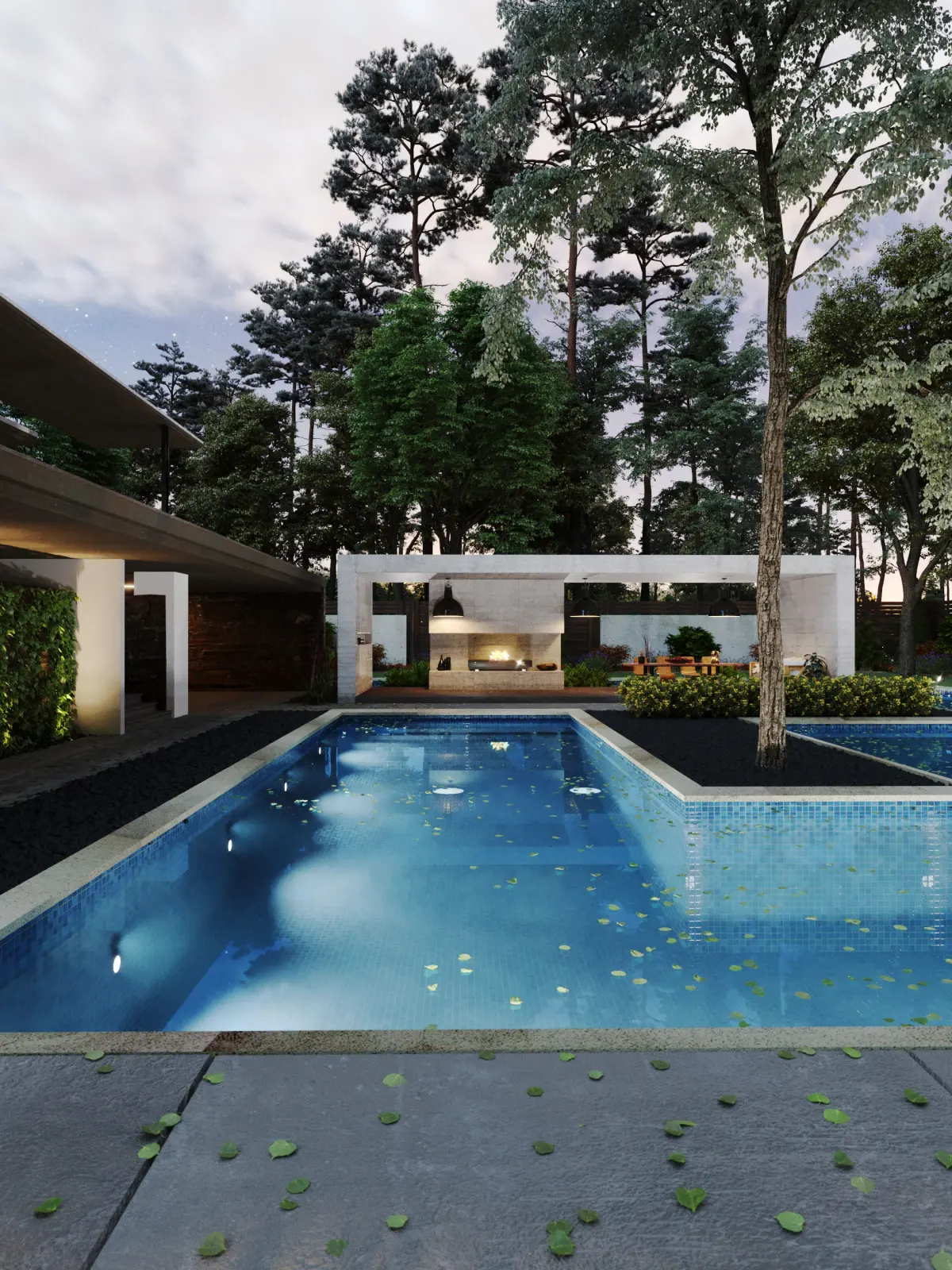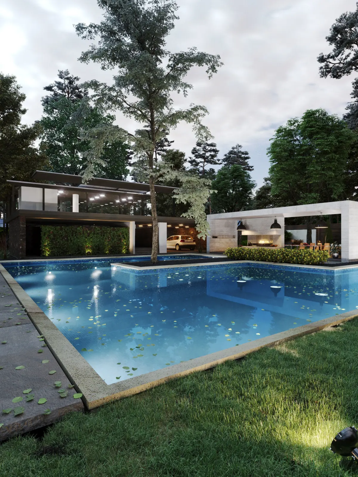 Here we go the Full Scene of a Modern House locate in a Village in middle of forest! A big and cool swiming pool included. Fallen leafs on nice backyard.