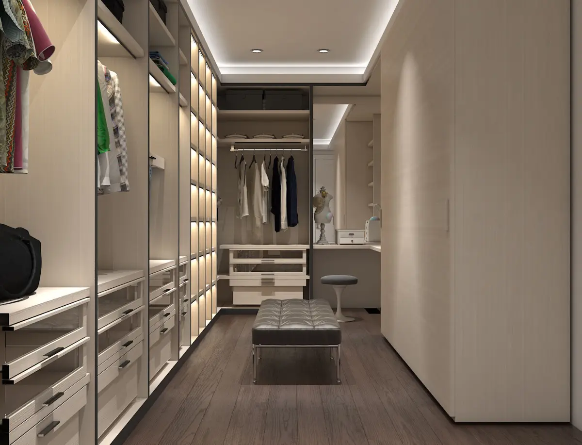 High-quality 3D model of a luxury dressing room, designed with attention to detail and realism. This model includes fully detailed storage units, shelves, drawers, hanging sections, and integrated ambient lighting — perfect for realistic interior scenes.