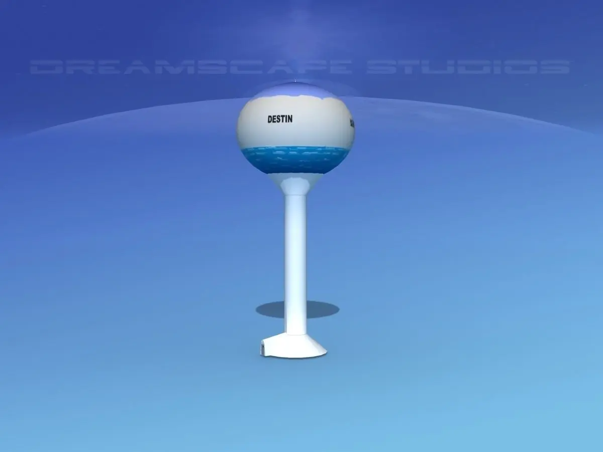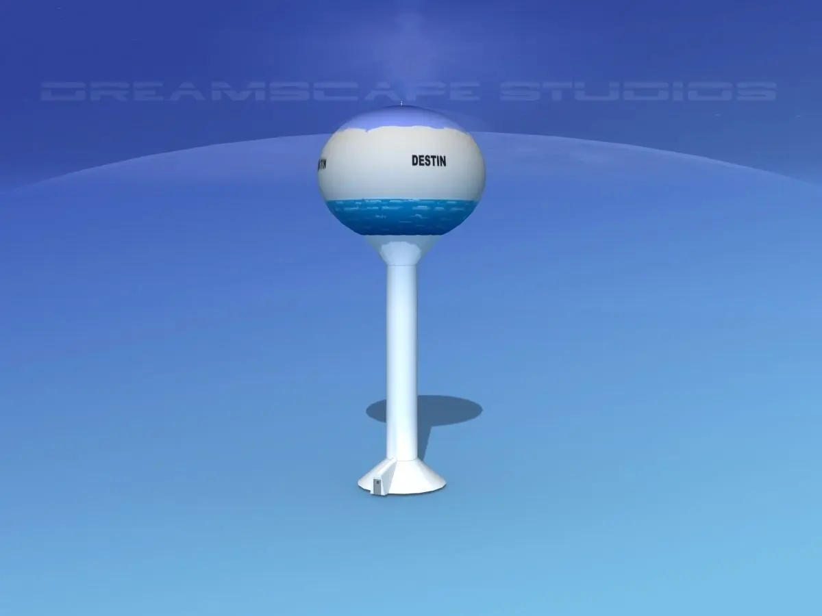 This modern water tower is supplied by a pumping system in the base drawing water from under ground water sources. It retains the water in the upper tank allowing gravity to provide water to the surrounding area. These tanks can supply thousands of homes with drinking and other waters from underground aquifers.