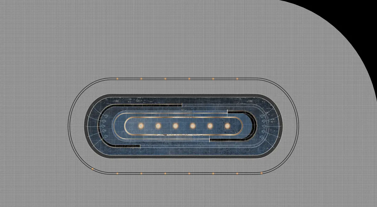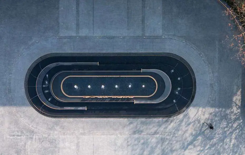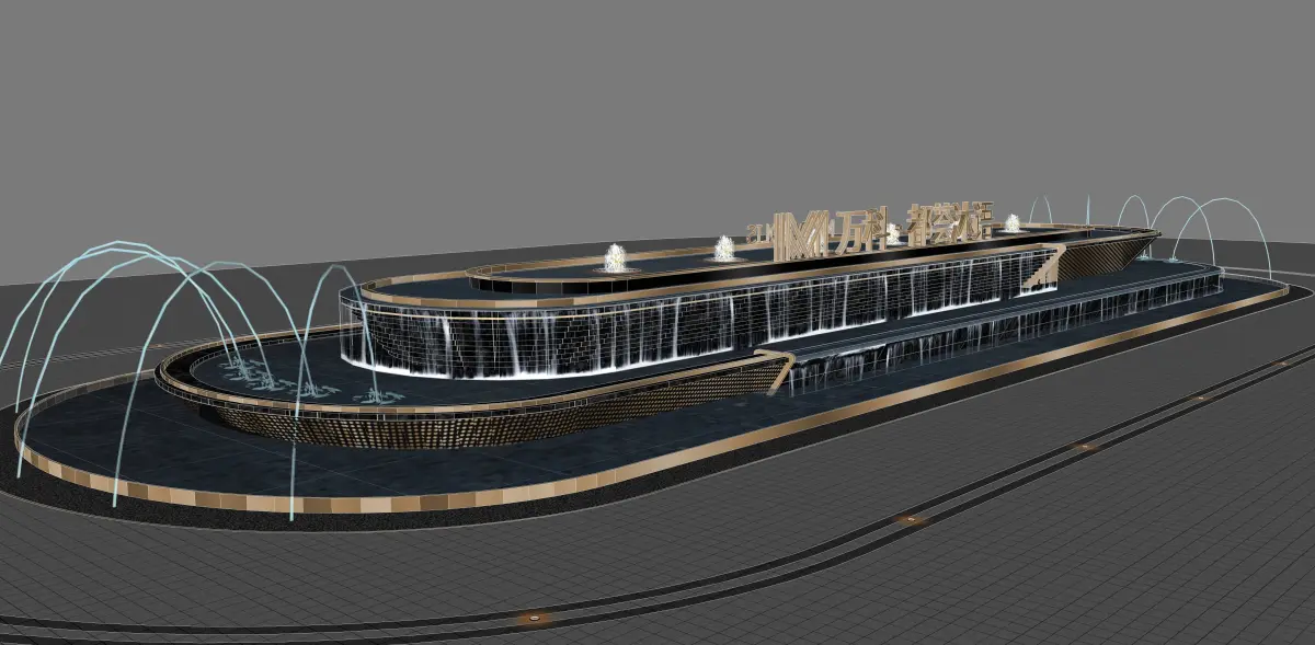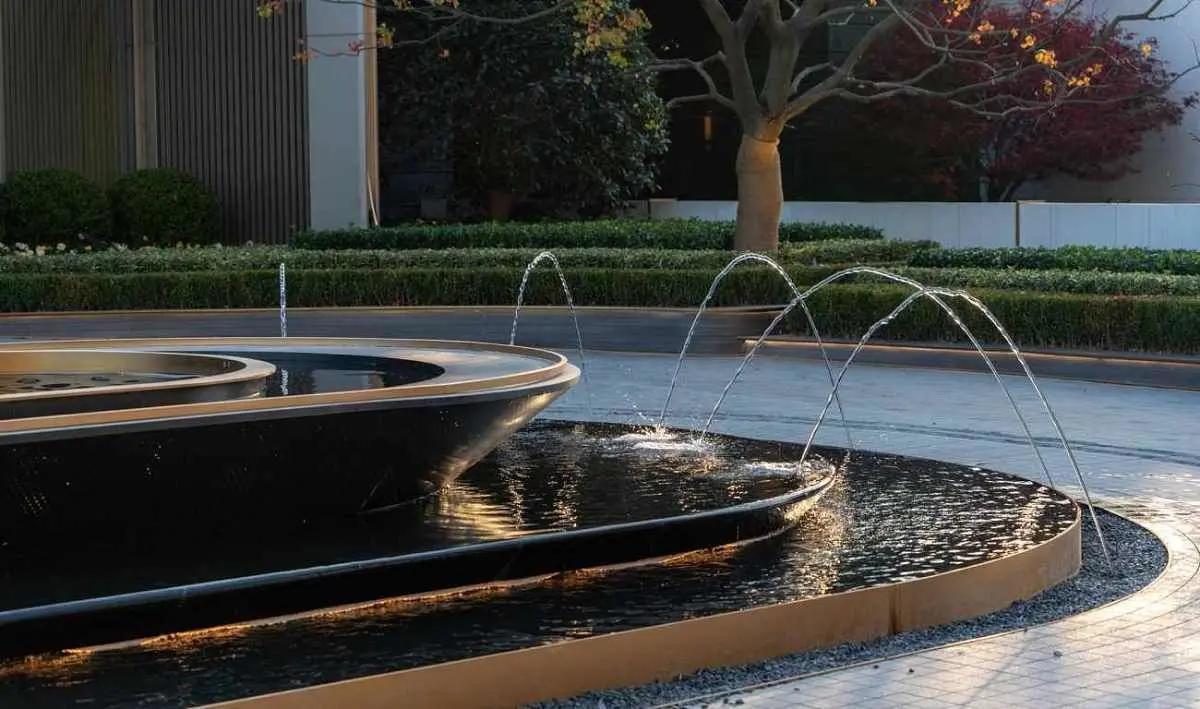This modern water feature incorporates sleek, minimalist design elements with technology such as LED lighting and programmable water jets. It includes materials such as perforated plates, stainless steel, concrete and features a recirculating water system for sustainability.