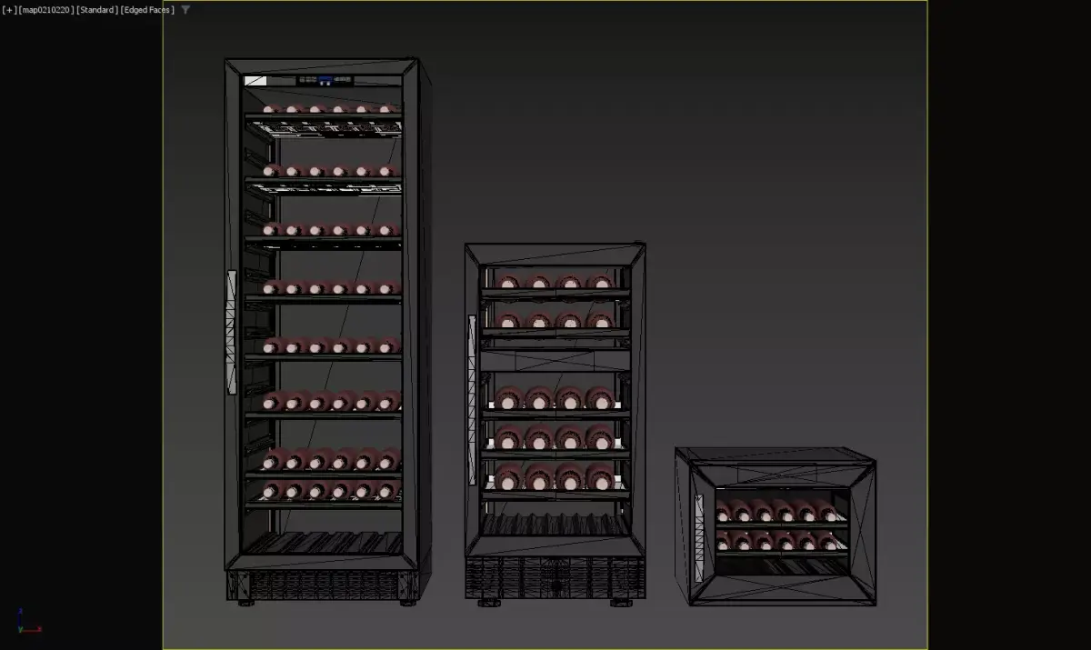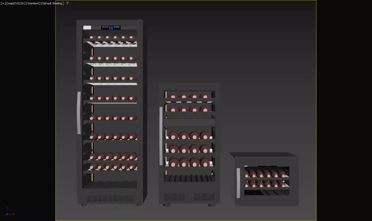 Collection of modern wine coolers in various sizes, featuring black finishes, LED lighting, and digital temperature controls. Ideal for wine enthusiasts and home interior design, providing stylish and functional storage for wine bottles in living rooms, kitchens, or home bars.