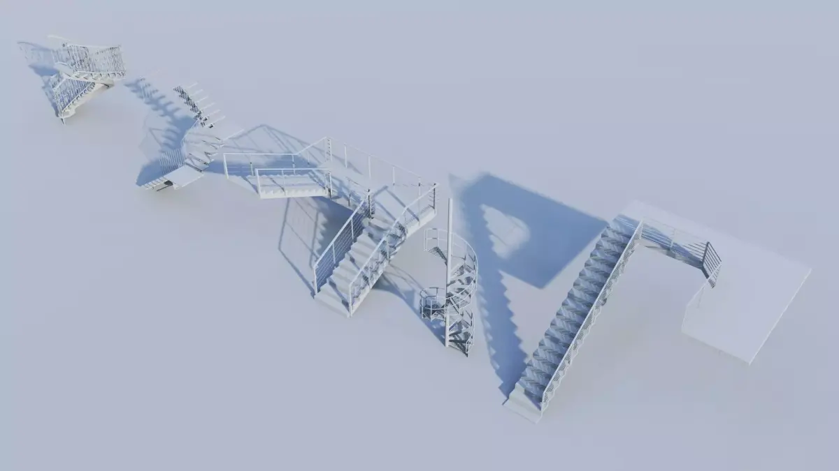 High-Detail Joinery: Features realistic mounting brackets, tread supports, and connection hardware, perfect for high-resolution close-up renders.