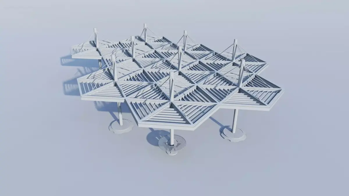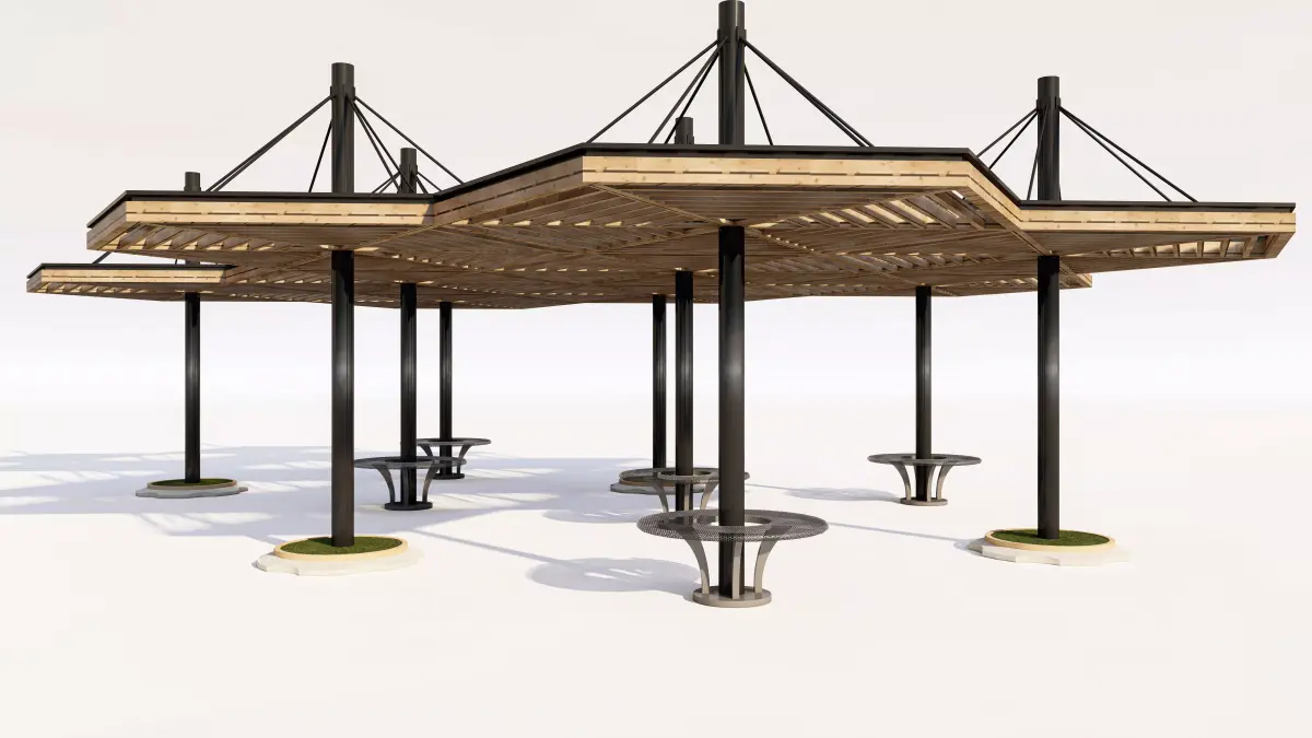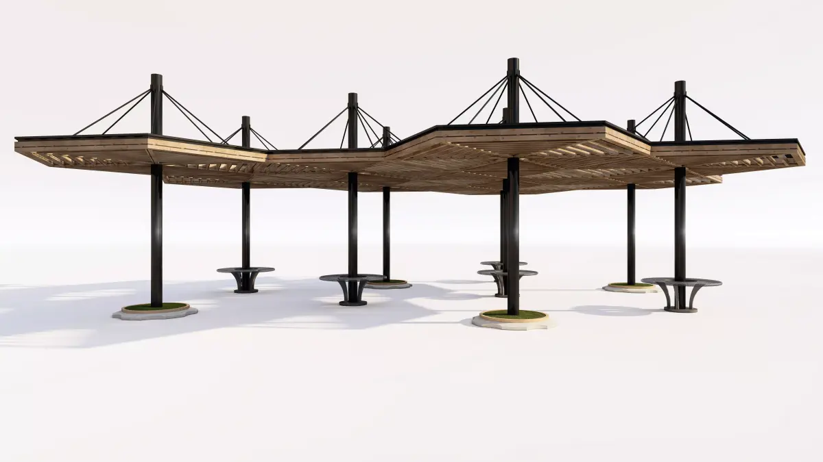 Structure: A robust, multi-faceted roof structure supported by a system of tall, dark steel or concrete columns. The roofing section uses natural wood slats in a layered design, allowing for filtered sunlight and modern aesthetics.