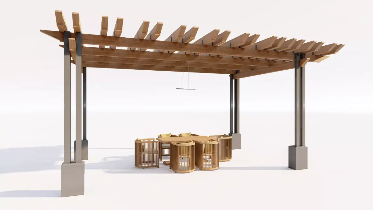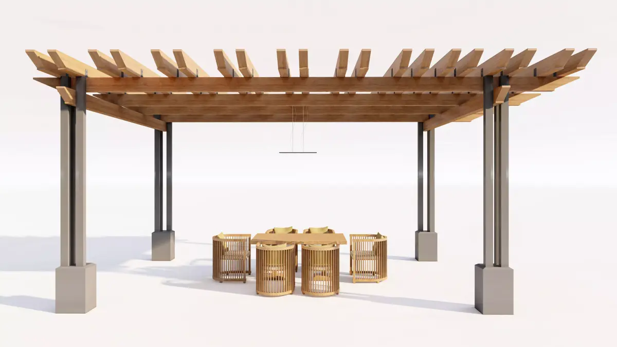 Support System: The pergola roof is supported by tall, sleek dark metal columns which rise from low-profile, light-colored concrete bases, creating a modern, mixed-material aesthetic.