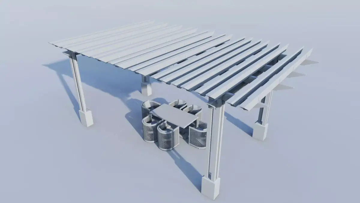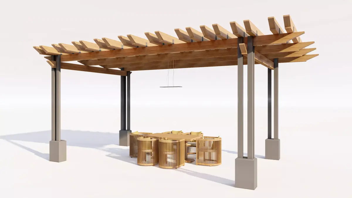 Pergola Structure: A robust rectangular frame with a slatted wooden roof structure, allowing for diffused light and stylish shading.
