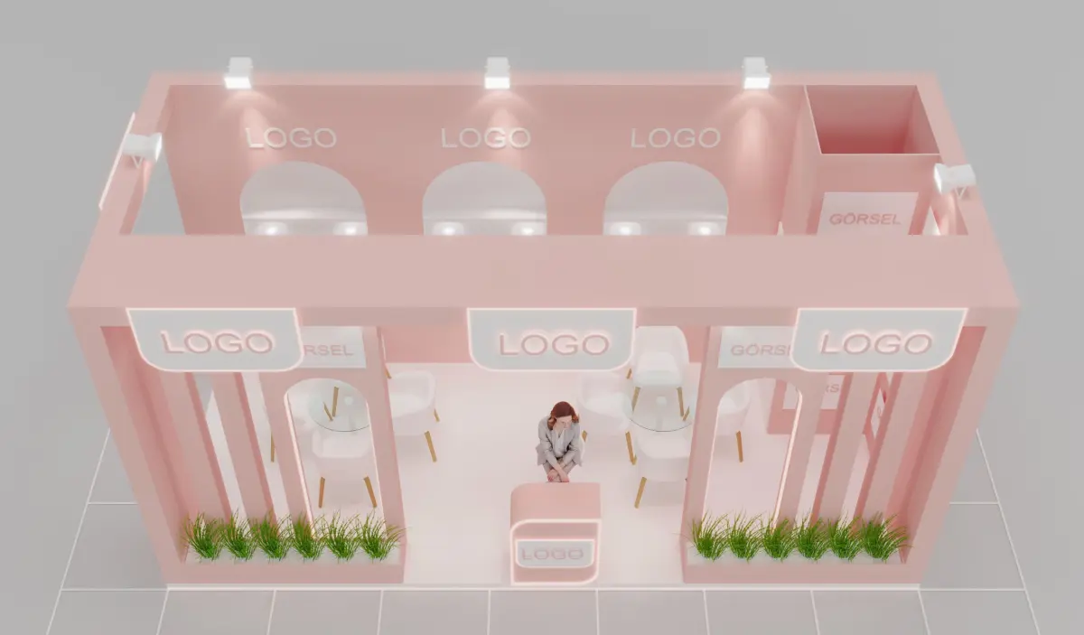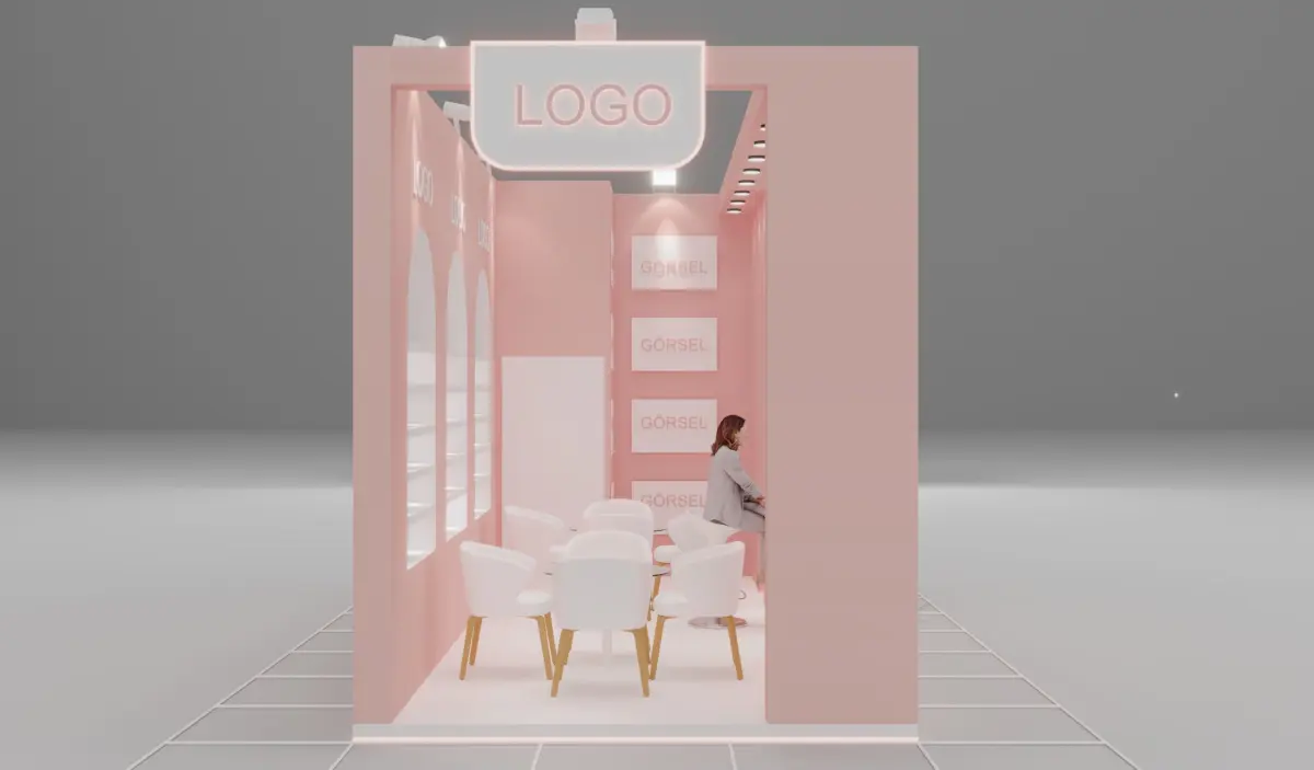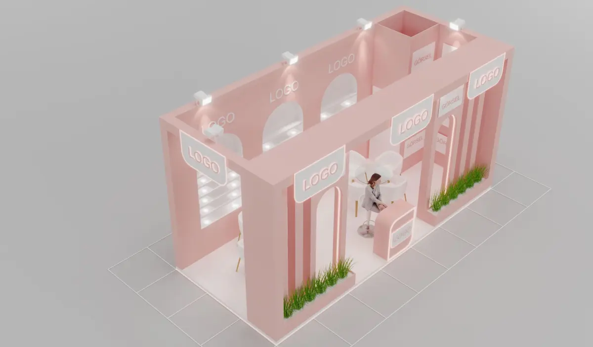 This is a modern wooden cosmetic exhibition stand designed for trade fairs, beauty expos, and product launches. The booth features soft pastel pink tones, elegant arches, LED logo panels, seating areas with white chairs, and decorative plants.Ideal for showcasing skincare, makeup, or wellness products. The 3D model is prepared in 3ds Max 2024 with clean topology, including all materials and textures.