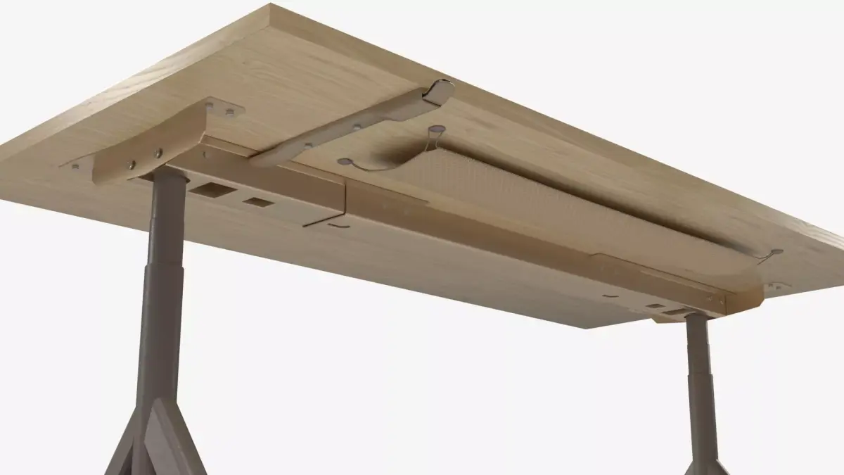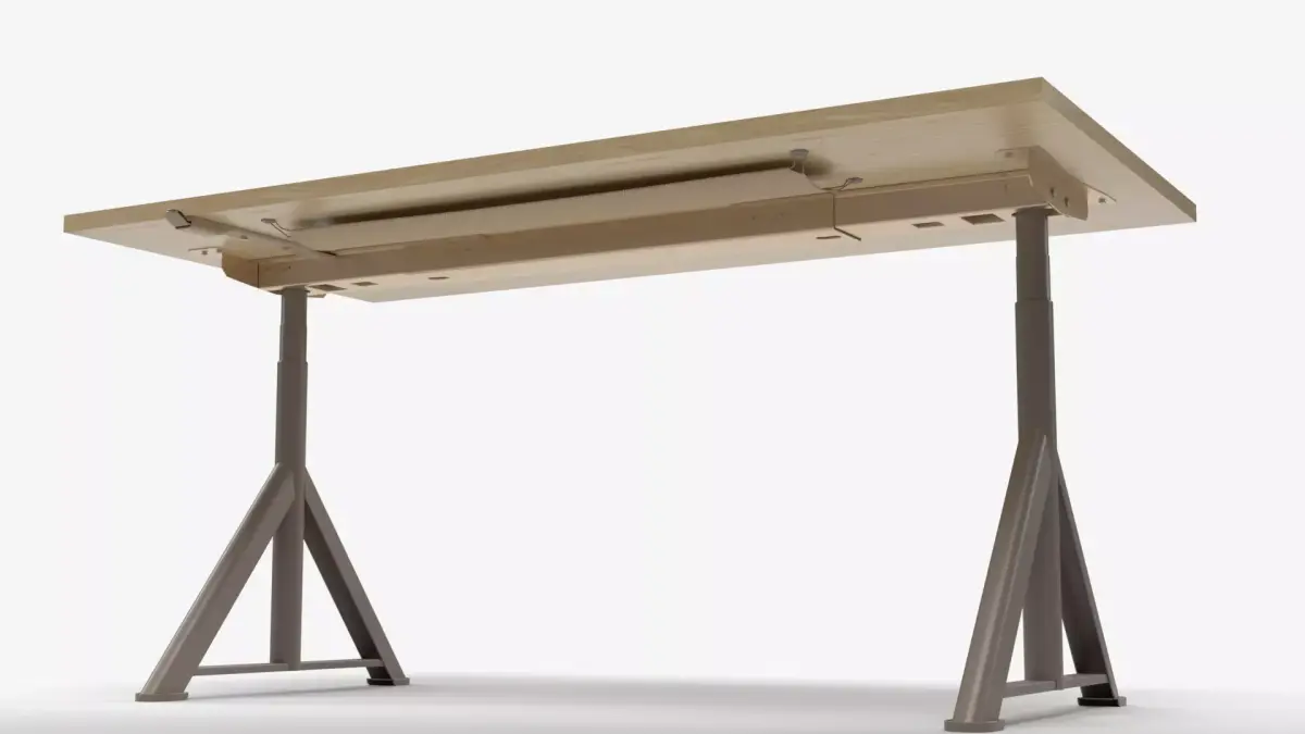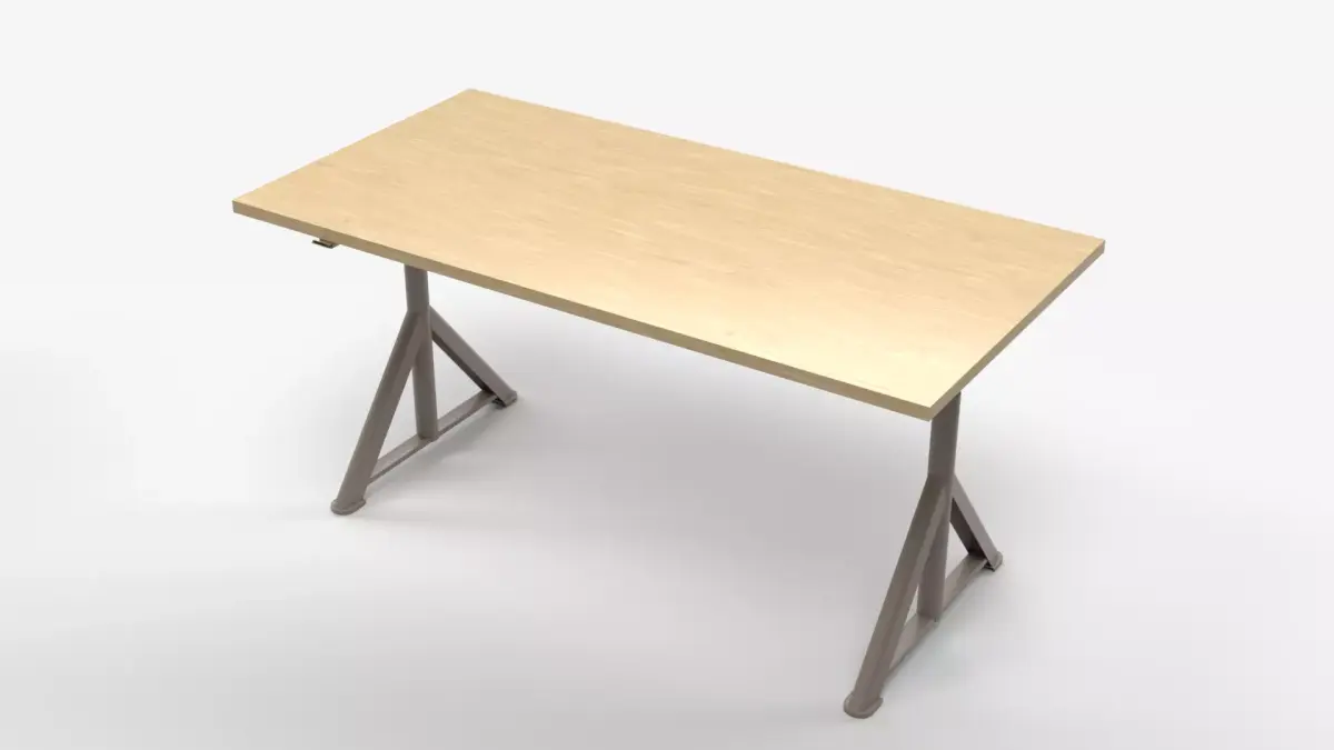 This high-quality 3D model features a modern industrial workspace setup, including a natural wood tabletop desk supported by sturdy A-frame metal legs and a vintage-style adjustable workshop stool.