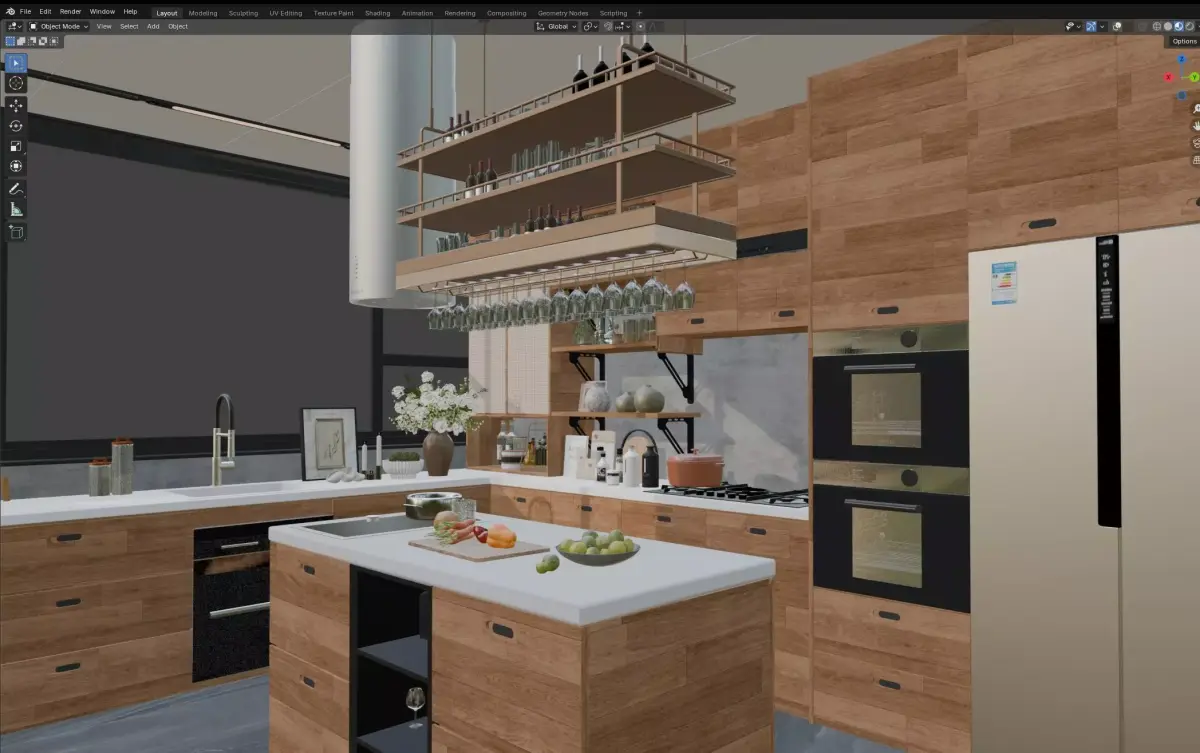 Modern Wooden Kitchen with Island and Built-in Appliances 3D model