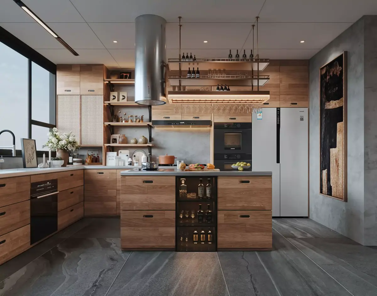 Home Catalog Modern Wooden Kitchen with Island and Built-in Appliances 3D model