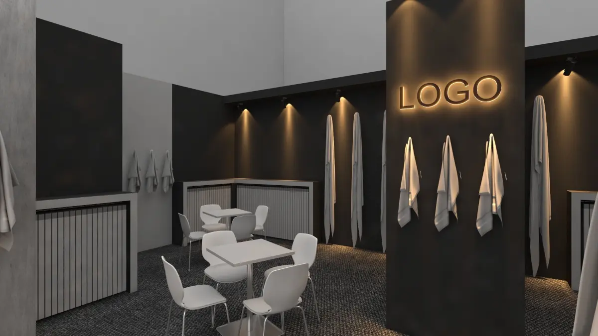 Carefully placed spotlights highlight the towel niches, while the backlit LOGO areas ensure strong brand visibility. Three modern seating areas with tables and chairs offer functional spaces for visitors or product discussions.