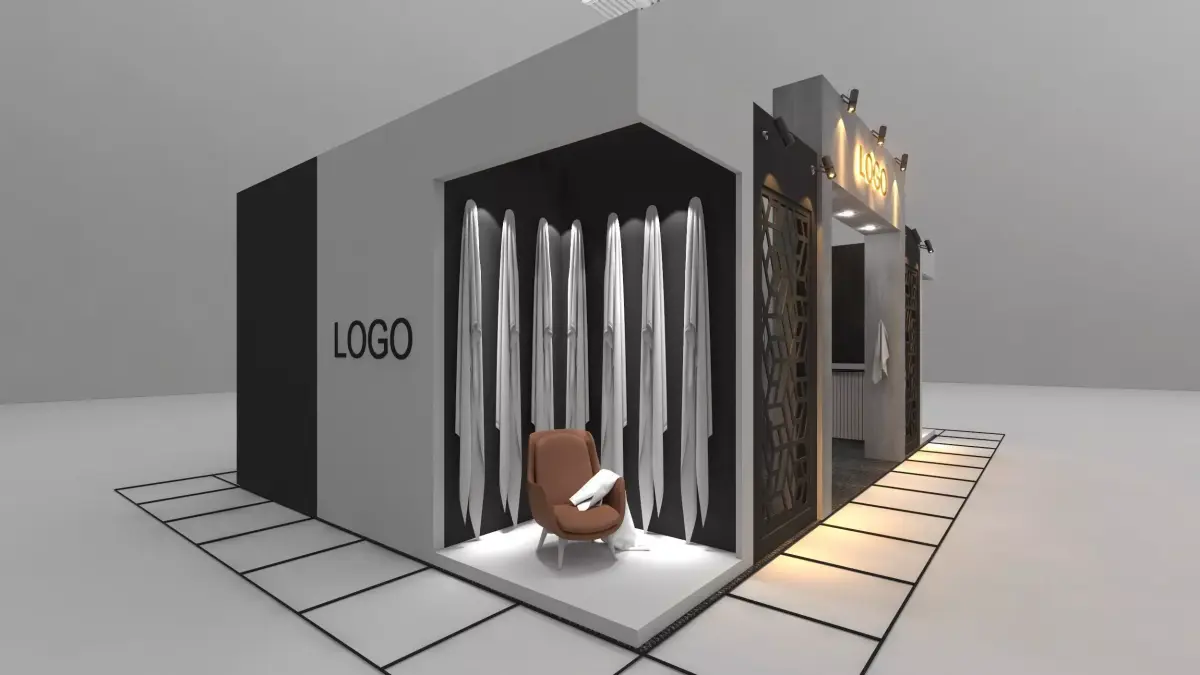 This professional 3D model presents a modern wooden exhibition stand, ideal for showcasing towels or textile products at trade fairs, expos, or interior design visualizations. The stand features a combination of natural wood textures and anthracite-colored panels, creating a warm and elegant atmosphere.