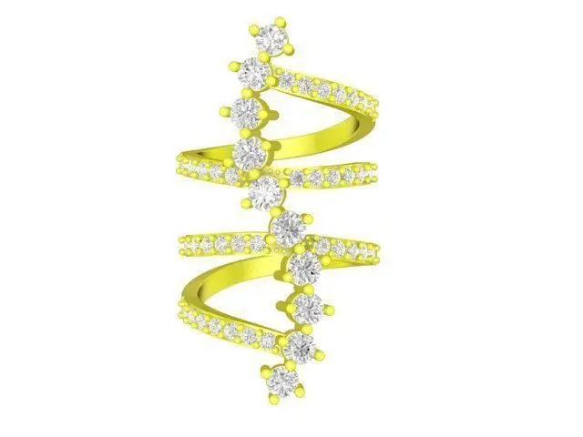 This 3D jewelry model features a modern zigzag multi band ring design with a flowing, wave-like structure. Multiple bands are elegantly connected and decorated with round stones arranged along the zigzag path, creating a dynamic and eye-catching appearance.