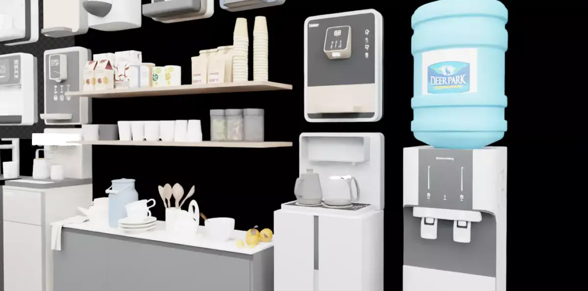 A comprehensive set of 3D models for modern office drinking water equipment. Includes various water dispensers, kettles, cups, and related accessories. Features realistic designs and details, perfect for office scene simulations, interior design projects, or product visualizations. Ideal for adding a professional and functional touch to your digital office environments.