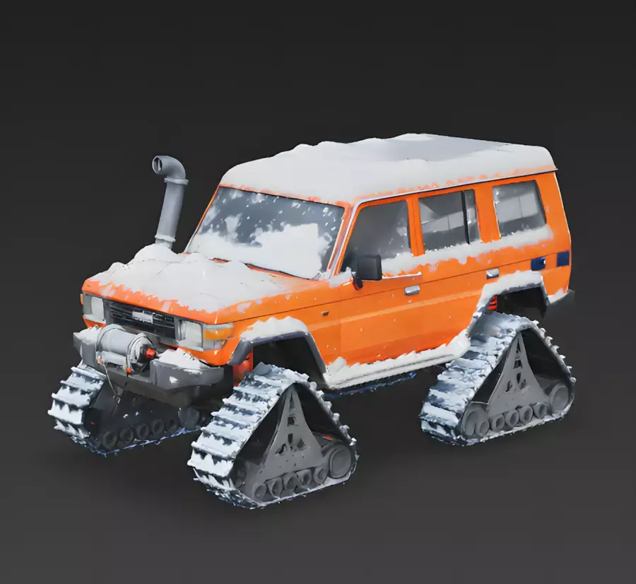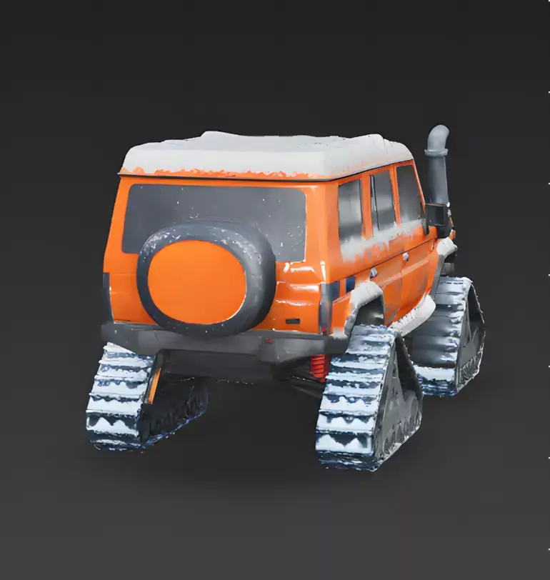 The Overall Concept This asset is a rugged, boxy off-road SUV that has been heavily modified for arctic exploration. It replaces standard wheels with tank tracks, making it the ultimate vehicle for deep snow and extreme terrain.