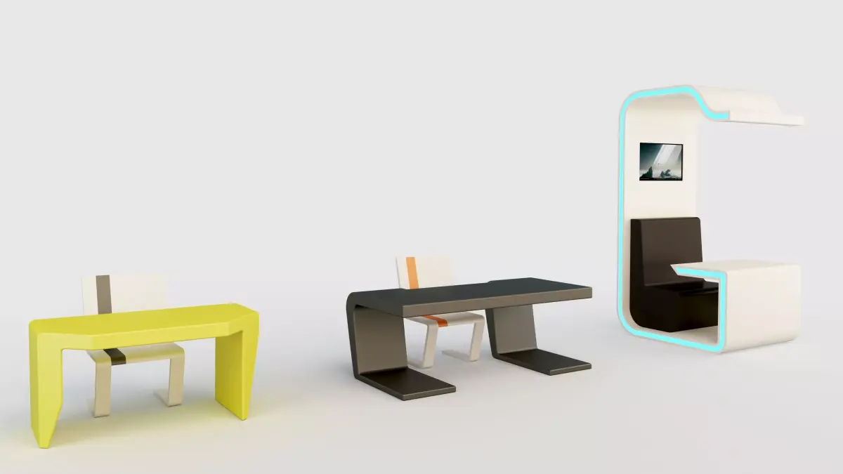 Many combinations can be made to achieve different results. The Booth/Cubicle has an inset for 32"display monitor, has an ergonomic seating with 1 meter width. At each side there is plexi glass with cyan neon light underneeth.