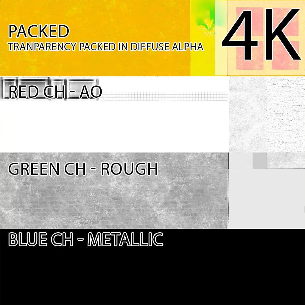 textures are in TGA format and include :Diffuse mapNormal mapPacked transparency in Diffuse alpha channelPacked ARM : red channel is AO - Green is roughness - Blue is Metallic